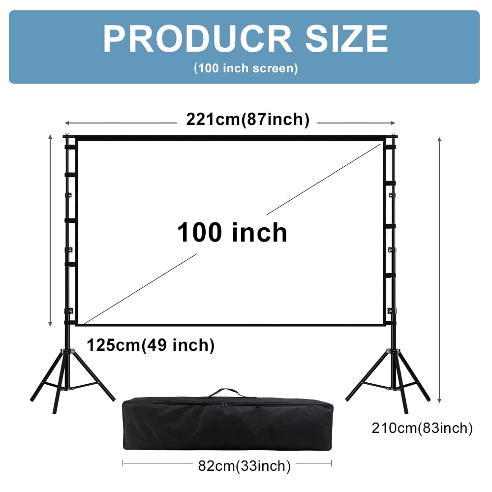 $42.13【Excellent Projection Display】This 100-inch cinema projection screen with stand, 16:9 aspect ratio, 160-degree wide angle. This portable projector screen will be your projector and your good friend. Cinema projection screens are designed to provide clear, high-resolution images, rich colors, and a great viewing experience in different viewing positions. Innovative design: This projector screen is made of high-quality steel retractable tripod stand, which is more convenient to carry and more stable to use. The upgraded projection screen guarantees your viewing experience even in windy conditions. 【High-quality accessories】The telescopic design of the projection screen with bracket is made of high-quality steel pipes, and the surface is made of anti-rust paint, so there is no need to worry about rust and bending. The buckle structure is matched with the hole nut to make the overall support more stable. The triangular structure and included fixtures further enhance the user experience. 【Lightweight and Portable】Our projector screen weighs 11.3 pounds, has a smaller footprint, and is easy to carry indoors and outdoors, providing you and your family with a great audio-visual experience anytime, anywhere. It is the perfect gift for birthdays, holidays, and anniversaries. After-sales service: This product is equipped with a 16:9 HD projection screen, 1 projection screen, 2 tripods, 1 storage bag. We provide professional customer service, you can contact us for any questions about this product, and we will answer your questions within 12 hours.