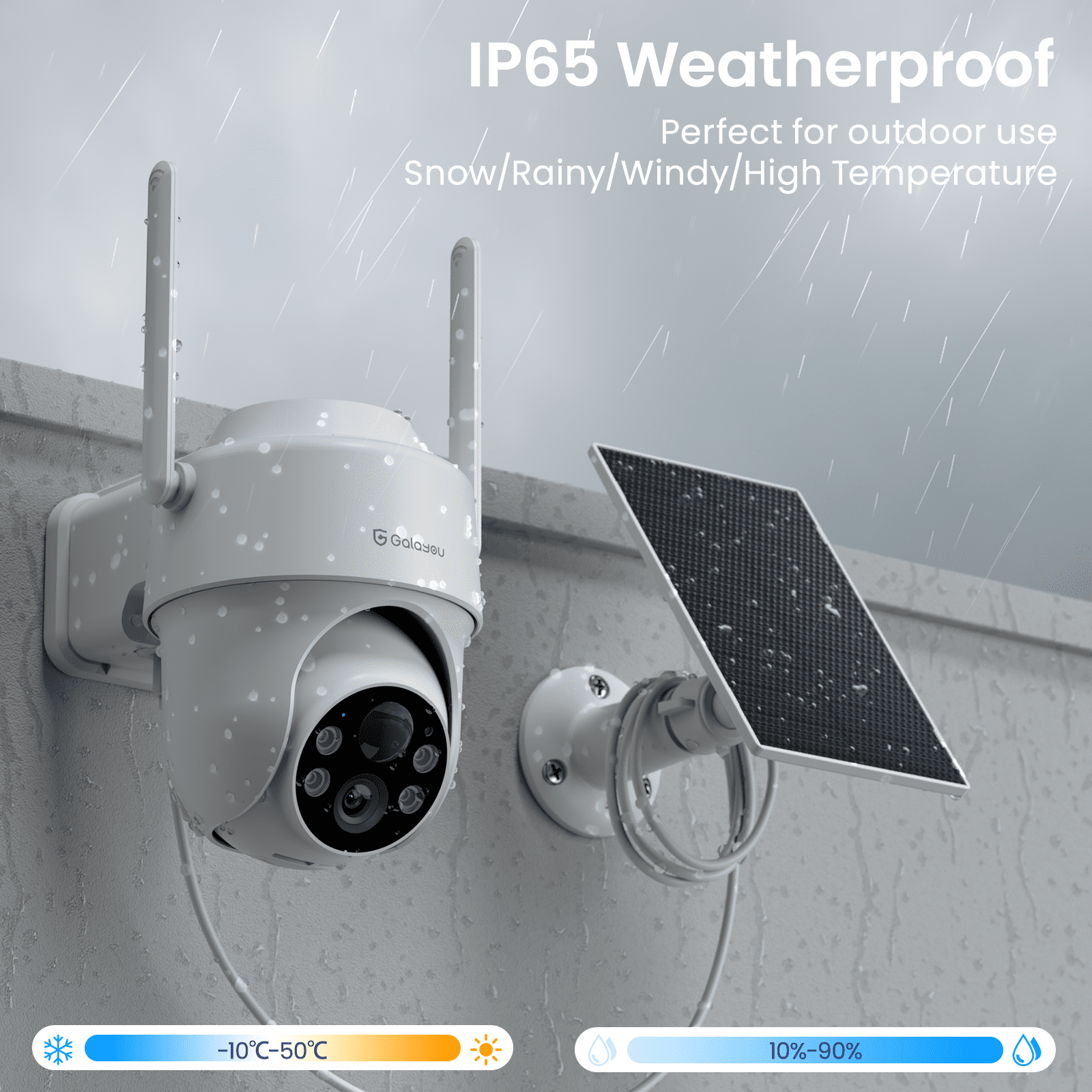 $34.39Original price was: $34.39.$30.95Current price is: $30.95.Upgrade your home security with Galayou 2K solar security WiFi camera! Designed to withstand the elements with its IP65 waterproof rating and powered by solar energy. With its crisp 2K resolution, 4 powerful spotlights, and 360° PTZ features, this camera provides unmatched coverage and clear nigh vision. Stay connected with instant alerts via PIR motion detection. The smart siren works with spotlights to deter intruders with ease. You can communicate with visitor in real-time using the two-way audio function. 【2K Resolution & Tilt/Pan/Zoom】2K battery-powered wireless outdoor surveillance camera provides clearer images than 1080P day and night. It supports 350° horizontal rotation, 90° vertical rotation, and 16x digital zoom, ensuring overall protection of your home without blind spots. 【PIR Motion Detector】Solar outdoor camera with built-in PIR motion detector, unlike other ordinary cameras, can identify the human body based on temperature and greatly reduce false alarms. A 10-second motion video is recorded in the app, and you’ll receive a real-time notification on your phone when it detects motion. 【Color Night Vision with Floodlight & Alarm Siren】Wireless outdoor camera supports 3 night vision modes: infrared mode, color mode and siren mode. In siren mode, the alarm siren and spotlights turn on automatically when the camera detects motion, so you can know immediately and scare away unwanted people. 【Two-Way Audio & Sharing with Family Members】Wireless wifi outdoor solar camera has a built-in speaker and microphone, so you can talk to the person in front of the camera or fend off invaders through the app. What’s more, it is very convenient to share your camera with up to 3 users, they are allowed to view videos in the APP simultaneously.