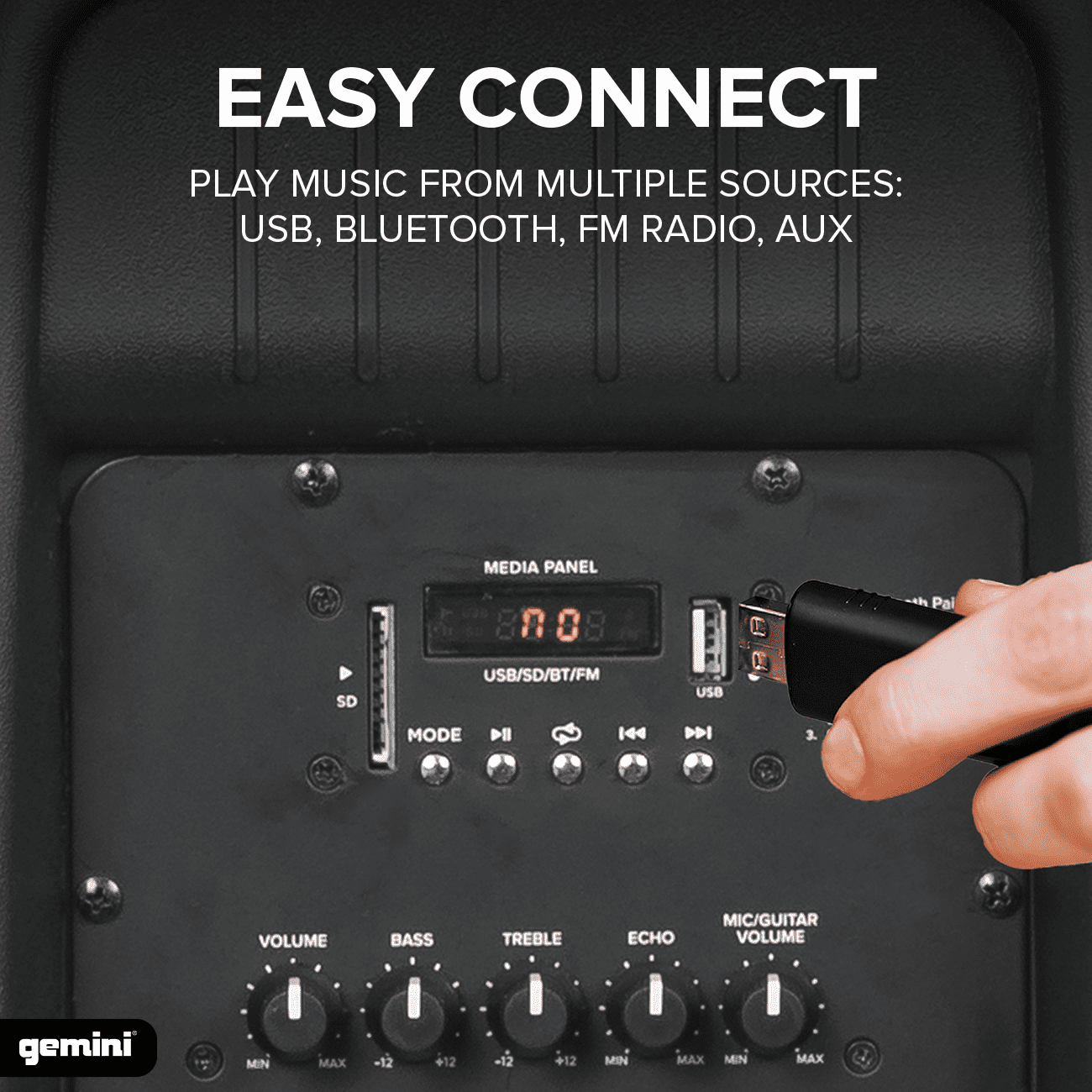 $214.96Stream music wirelessly from any Bluetooth-enabled device with Gemini AS-15TOGO Portable Bluetooth Speaker. This Bluetooth speaker system is a powerful all-in-one system for your favorite devices such as your smartphone, tablet, laptop, computer, etc. The portability and versatility make it perfect for a wide range of live and playback applications, even where there’s no power source. Powered by the included AC power supply and via the long-lasting internal rechargeable battery. This 15-inches Bluetooth speaker is made to be portable with retractable luggage handle & wheels making it easy for you to take everywhere you go. Perfect for outdoor parties, dancing activities, rehearsals, and any other occasion where portable music is needed. At Gemini, our goal is to design products that offer value and innovation in the DJ and Pro Audio markets. Since 1974, we’ve evolved and thrived by understanding the needs of our customers and recognizing industry trends. From our humble beginnings, we understood the potential of the DJ movement, and our ability to support this movement not only helped us grow as a company, it helped DJs gain recognition and esteem, calling deserved attention to their roles as artists and performers.