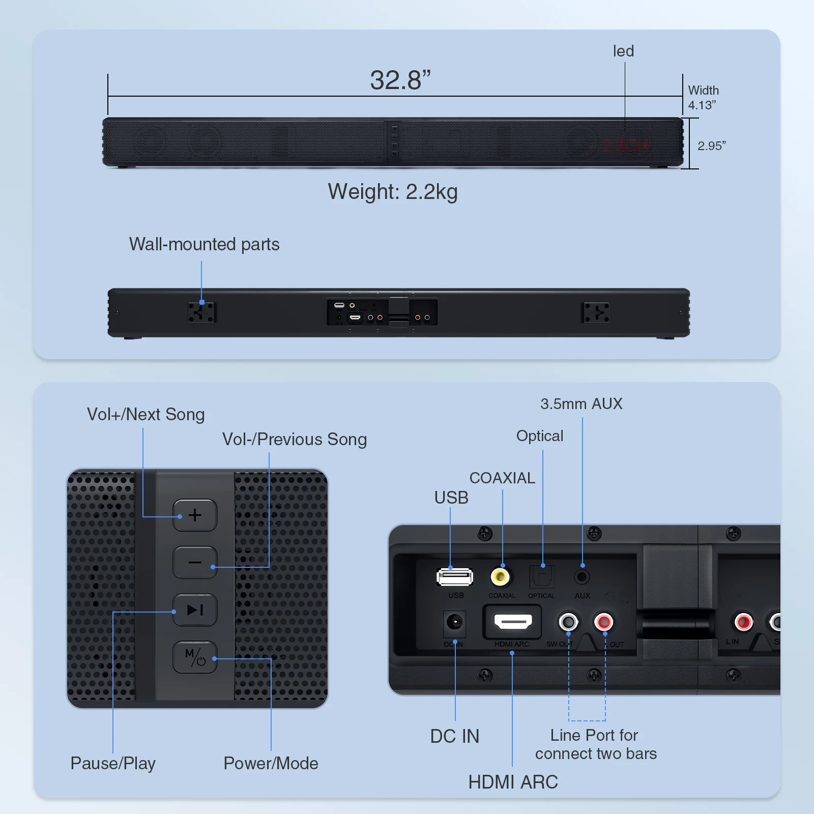 $111.79Original price was: $111.79.$51.59Current price is: $51.59.【Perfect Gift For Your Loved One】 Best gifts for your family and friends. It is a good choice as christmas, new year, birthday, holiday gift and other festival gift. 【Tips】 When connecting a TV using the HDMl ARC Out connection modes, most TVs will automatically switch to PCM sound output mode which is compatible with the soundbar. When you use apps such as NETFLIX, HULU on your smart TV, please turn of DOLBY and/or DTS function in the app sound settings or choose STEREO output to ensure that the soundbar will be compatible with your TV. Please kindly refer to the TV user manual for specific audio settings. If there is an incompatibility issue, please manually set the TV’s audio(sound) to PCM output mode. 【Package Content】 two tower speaker (please use the line cable to combine them into soundbar, NOT having a soundbar and two tower speaker at the same time) 1x Remote control 2x Stand Bases 1x DC Adapter 1x Long line cable 1x Short line cable 1x HDMI ARC Cable 1x AUX audio cable 1x AUX to RCA audio cable 1x Optical cable 1x User Manual Few Wall mount screws