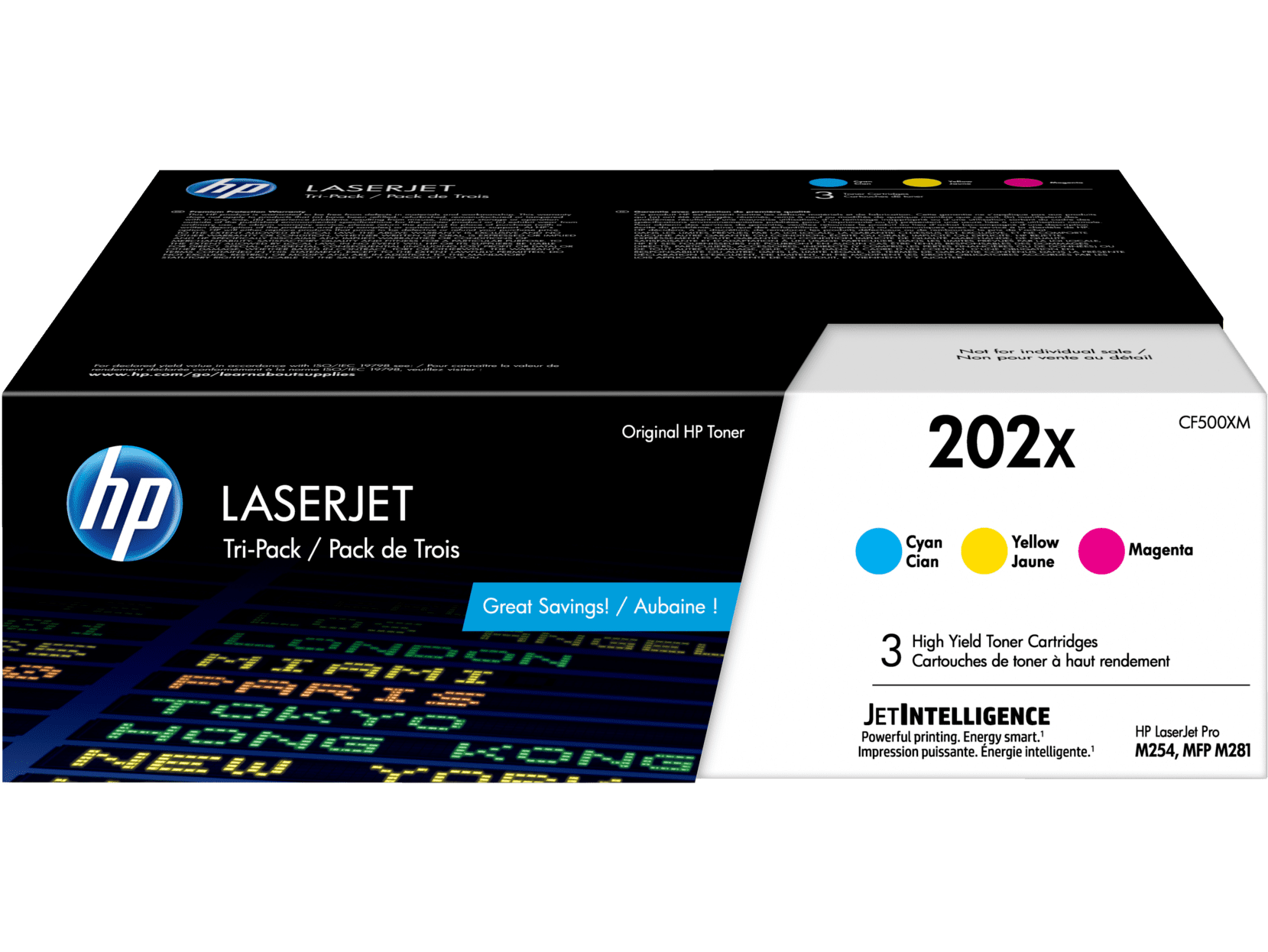 $329.29Print with toner cartridges you can trust: Original HP 202 toner cartridges. Original HP toner cartridges provide precision output page after page, free and easy recycling, meet stringent eco-label emissions criteria for indoor air quality, and are designed for security you can trust. Keep your business running smoothly with Original HP 202 toner cartridges. • High-yield toner cartridges yield up to 2500 pages. • This package includes yellow, cyan, and magenta cartridges. • This HP toner cartridge delivers high-quality printing. • Multi-pack saves you money. • Compatible with HP Color LaserJet Pro M254 printer series, HP Color LaserJet Pro MFP M280 printer series. HP 202X Cyan/Magenta/Yellow High Yield Toner Cartridge, 3/Pack (CF500XM) is compatible with the following HP printers: HP LaserJet Pro M254, M281cdw, M281dw, M281fdw. What’s in the Box: 1 Cyan (CF501X), 1 Magenta (CF503X), 1 Yellow (CF502X) Quality and reliability—precision output, page after page, to keep your business running smoothly Depend on consistent HP performance. Original HP toner cartridges are designed to work the first time, every time. Sustainability—feel good about printing with recycled materials Help close the loop. 100% of Original HP toner cartridges contain recycled content. Indoor air quality—consideration for the air where you live and work HP cartridges meet indoor air quality eco-label emission standards to help protect you and your employees from exposure to elevated levels of VOCs. Security—protect your printer and your data HP is vigilant about mitigating security risks to help reduce the risk of malicious code entering your computer or network from your cartridge. . • Sold as 3/Pack.