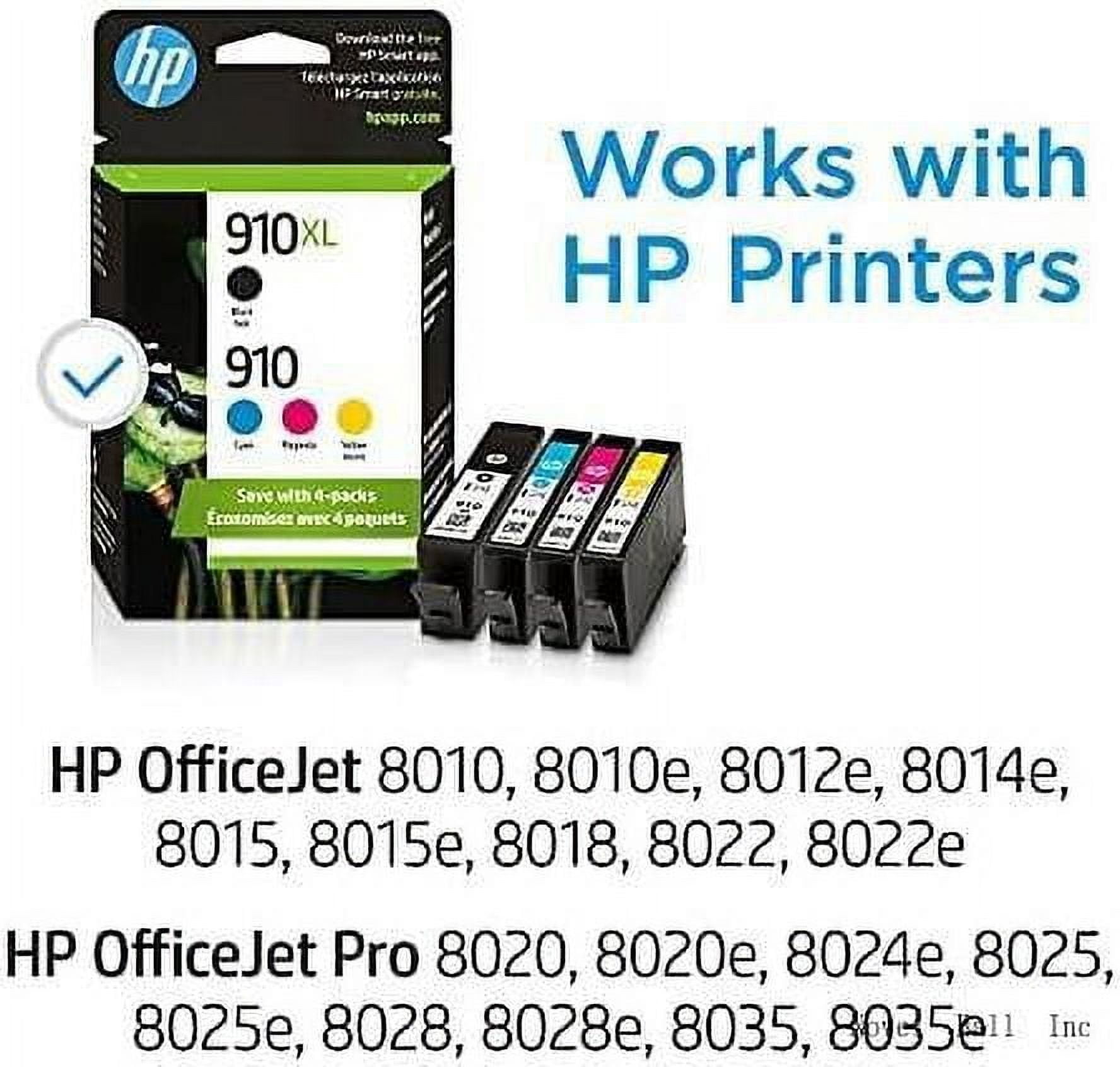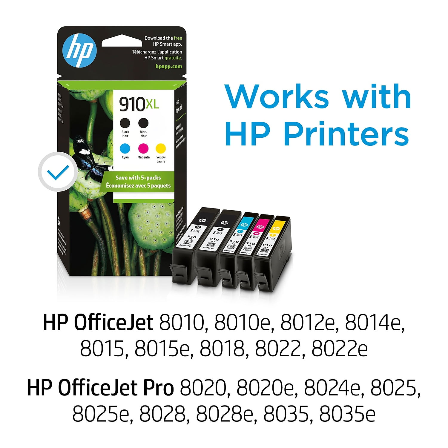 $196.94Count on Original HP 910 ink cartridges to deliver prints you can take pride in. Original HP ink cartridges provide precision output page after page, free and easy recycling, meet stringent eco-label emissions criteria for indoor air quality, and are designed for security you can trust. Keep your home or office running smoothly with Original HP 910 ink cartridges. • Print affordably with high-yield ink cartridges up to 825 pages. • Convenient multipack contains two black cartridges and one each cyan, magenta, and yellow cartridges; replace each cartridge separately as needed. • . • HP ink cartridges deliver high-quality printing. • Save time and money with this 5-pack ink cartridge bundle. HP 910XL Black/Cyan/Magenta/Yellow High Yield Ink Cartridges, 5/Pack (6ZA558AN) is compatible with the following HP printers: HP OfficeJet Pro 9010, 9015, 9015e, 9016, 9018, 9019, 9020, 9025, 9025e. What’s in the Box: 2 Black (3YL65AN), 1 Cyan (3YL62AN), 1 Magenta (3YL63AN), 1 Yellow (3YL64AN) Quality and reliability—prints you can take pride in Keep your memories alive with reliability you can trust. On average, Original HP inks print more than 2x the pages than non-HP inks tested. Sustainability—feel good about printing with recycled materials Using recycled content in our ink cartridges helps to reduce HP’s carbon footprint in plastics by up to 30%. Indoor air quality—consideration for the air where you live and work HP cartridges meet indoor air quality eco-label emission standards to help protect you and your employees from exposure to elevated levels of VOCs. Security—protect your printer and your data HP is vigilant about mitigating security risks to help reduce the risk of malicious code entering your computer or network from your cartridge. . • Sold as 5/Pack.