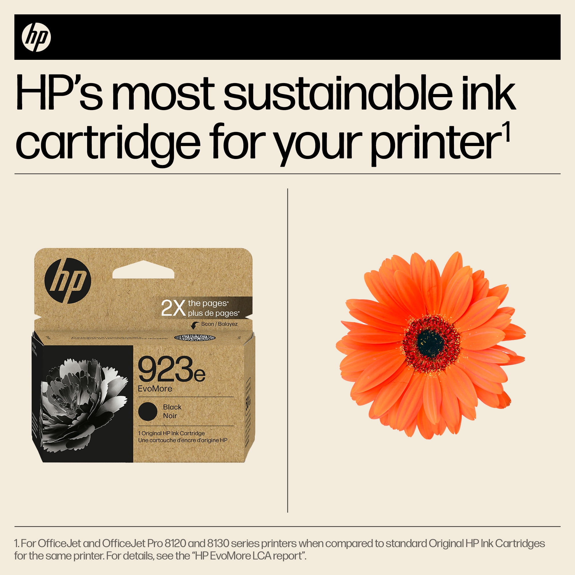 $62.69Overview Designed to print two times the pages as standard cartridges, have a lower carbon footprint and be easily recycled, HP EvoMore Original Ink Cartridges combine HP’s legendary performance and quality with added sustainability features. Ideal for high-volume and sustainability-conscious business printing Take pride in high-quality prints with Original HP Ink. Original HP EvoMore Ink Cartridges include all the Original HP Ink features you expect plus even more sustainability features with ecolabel certifications and a community to help restore forests and habitats in need. The choice you can trust to help avoid reprints and wasted supplies. Choose Original HP Supplies, designed for reliability and consistency. Benefits Print more pages with a high yield cartridge vs. standard Up to 1,000 pages Features Lower carbon footprint. 2x the pages. Lower carbon footprint compared to standard cartridges by getting twice the number of pages. Three simple and easy ways to recycle Choose one of three easy ways to recycle your used cartridges through HP Planet Partners. Let’s help restore our forests together Join the EvoMore Community to help restore forests by planting trees. See how at . Disclaimers For OfficeJet and OfficeJet Pro 8120 and 8130 series printers when compared to standard Original HP Ink Cartridges for the same printer. See . HP 923e/924e/925e EvoMore Ink Cartridges have a lower carbon footprint compared to standard 923/924/925 Original Ink Cartridges when normalized to print 1,000 pages. Based on LCA study conforming to ISO 14040/44 and third party verified. See HP 923e/924e/925e EvoMore Original Ink Cartridges compared to HP 923/924/925 standard Original Ink Cartridges. Page yield tested in HP OfficeJet Pro 8120 series. Average continuous printing yield of black and composite (cyan/magenta/yellow) based on ISO/IEC 24711 or HP testing methodology. Actual yield varies considerably based on content of printed pages and other factors. For details, see . Program availability varies. See . Climate Impact Partners, The CarbonNeutral Protocol, certified CarbonNeutral product, 2023 edition, . Lifecycle assessments (LCA) are verified by an independent third-party to conform to ISO 14040 and ISO 14044 and are used by HP to understand the carbon footprint for the ink cartridge. Using this data we calculate the carbon emissions for the ink cartridge. Recycling compared to request-an-envelope process for standard Original HP Ink Cartridges for the same printer. Applies to HP 923e, 924e EvoMore Ink Cartridges