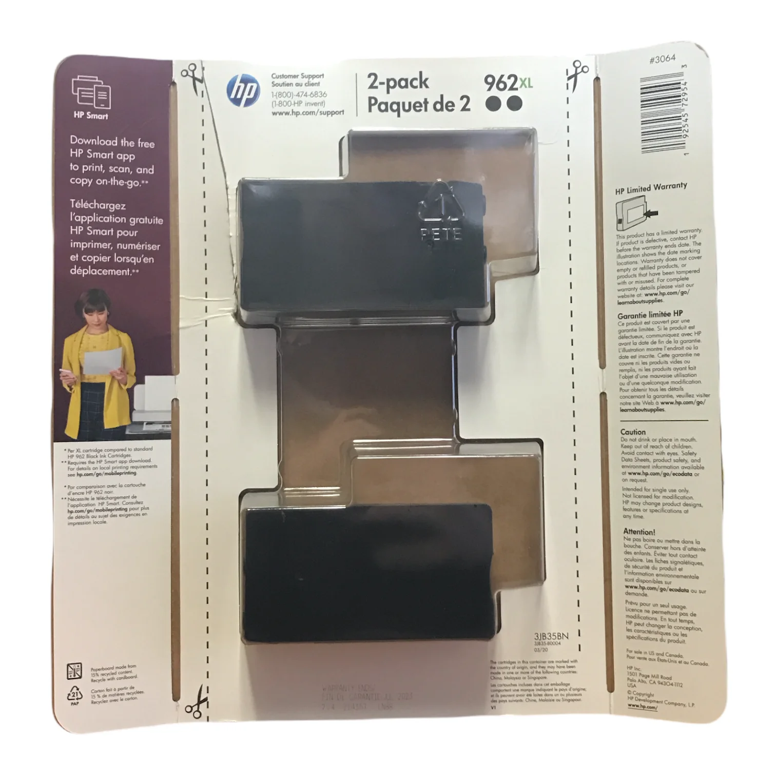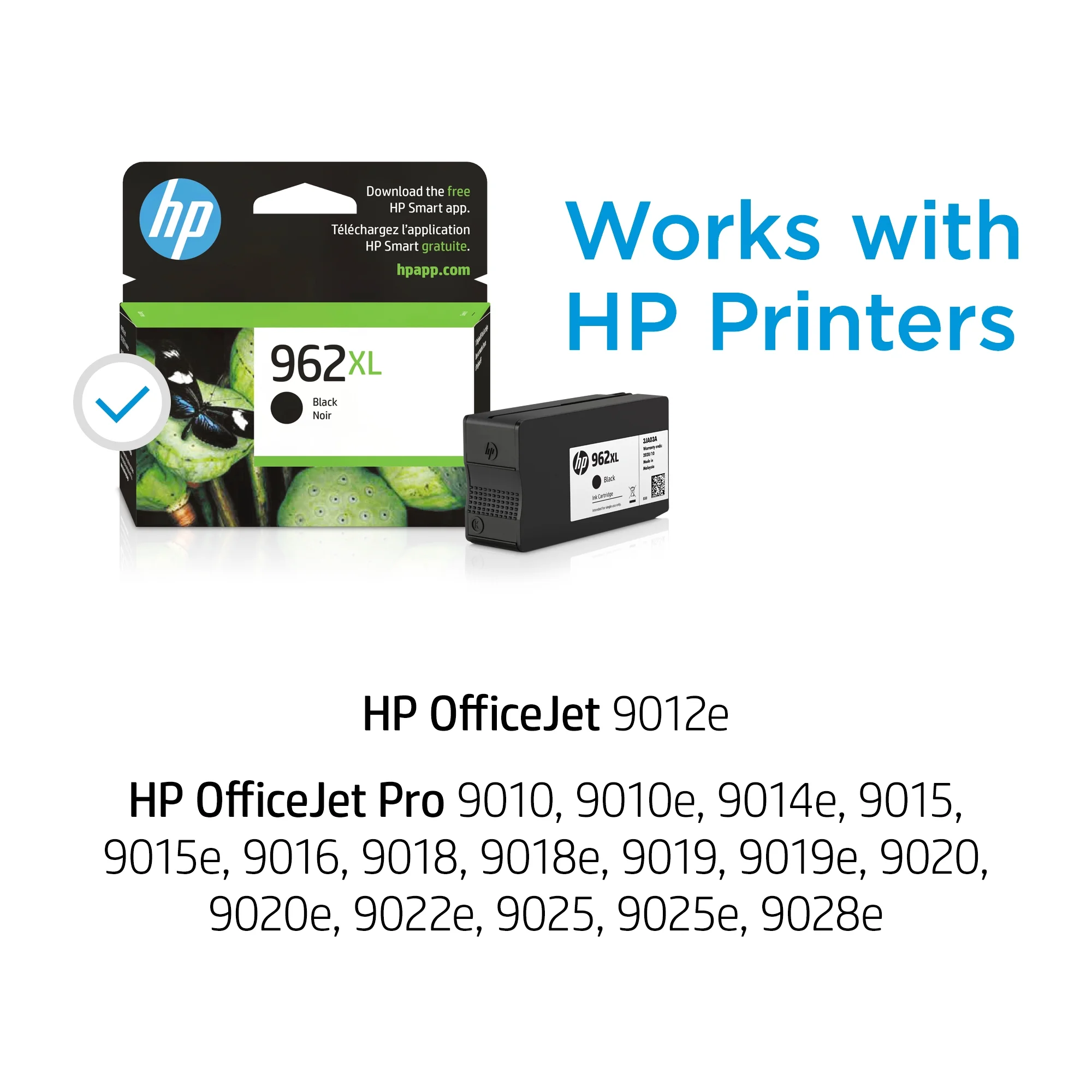$54.95Compatible HP models:OfficeJet Pro: 9010, 9012, 9013, 9014, 9015, 9015e, 9016, 9018, 9018e, 9019 Premier, 9020, 9020e, 9022, 9022e, 9025, 9025e, 9028e, Premier Print high-quality documents with Original HP ink cartridges designed to deliver worry-free performance and consistent results you can count on. Original HP Cartridges are the only cartridges precisely developed with HP printers for reliable quality, results, and consistent performance. What’s in the Box: 1 New HP 962 High Yield Black Original Ink Cartridge (3JA03AN) Page Yield up to 2,000 Pages Per Cartridge Print more pages, change cartridges less often, and save money, with high-yield cartridges and combo packs, as compared to standard cartridges. Buy an Original HP Ink Cartridge or never run out with HP Instant Ink, the Smart Ink Subscription. Terms and conditions apply. Helps Avoid Waste – Designed for extended use, helping reduce or eliminate material use and potentially save money. Recycling solution – designed to encourage recycling, helping you divert materials from landfill. Cartridge tested with an EPEAT Bronze/Silver Certified or Blue Angel Certified Printer. EPEAT’s environmental criteria covers the complete product lifecycle from design to end of life. Ranked in three tiers: Bronze, Silver or Gold.