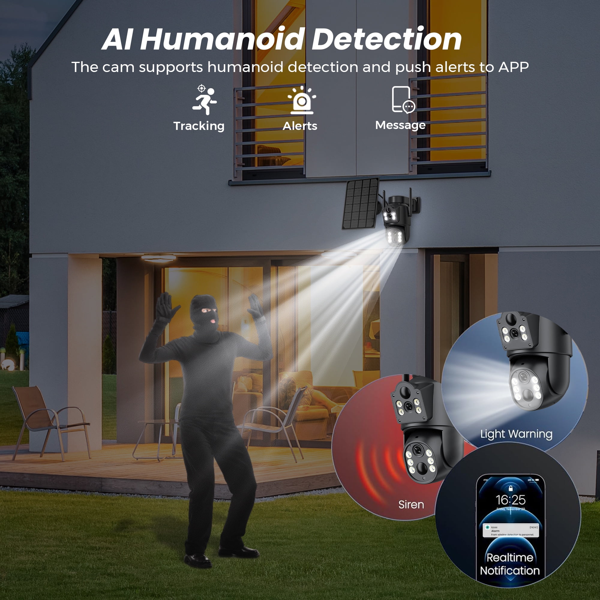 $51.59🌟2.5K/6MP Solar Security Cameras Wireless Outdoor with Spotlight, 360° View Wireless Outdoor Camera with Rechargeable Battery, Outdoor Wireless Camera with Auto Tracking Waterproof Human Detection, Color Night Vision, 2-Way Audio You can put it anywhere with a 5-minute installation!🌟 🌝 Ours Advantages of solar dual-lens cameras over ordinary cameras: Only one device can monitor areas in two different directions at the same time. All-round monitoring, no blind spots. Fixed cameras monitor key areas, while rotating cameras monitor all areas. Whether you are away from home or at home, whether you want to monitor your business or keep your property safe, this 2-in-1 outdoor surveillance camera is your ideal choice for all your security needs. 🌝 Day & Colorful Night in 2.5K/6MP Full HD: This outdoor camera wireless guarantees sharper and smoother video streaming. The 5X digital zoom allows for detailed close-ups, and the spotlight automatically activates when motion is detected at night, ensuring superior visibility and enhanced home security.
