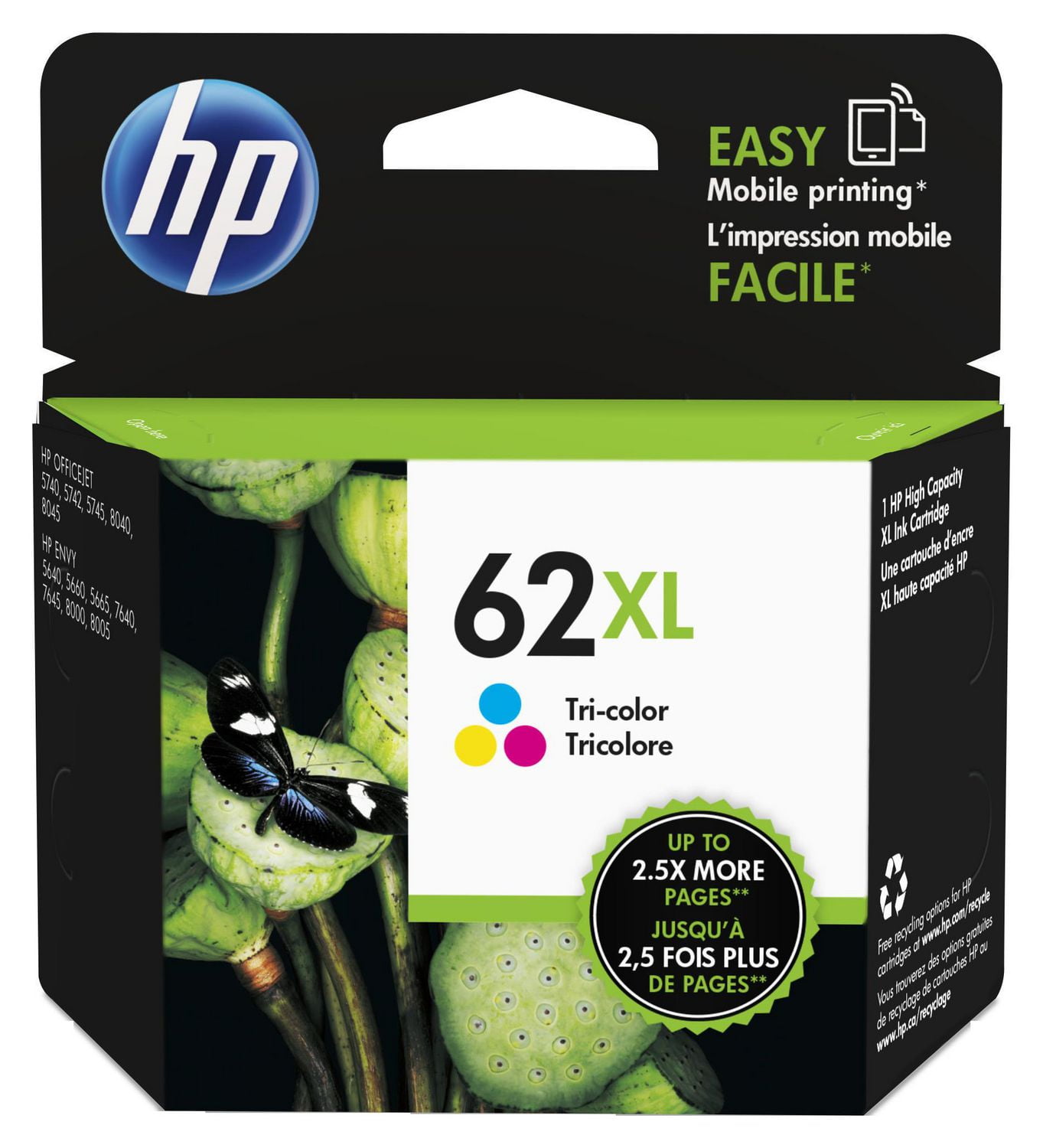 $98.0062XL High Yield Ink Cartridge, Black & Tri-Color, Features: Printer Compatibility: HP OfficeJet: 5740, 5660, 5665, 7640, 7645, 8000, 8005, HP Envy: 5640, 5660, 5665, 5665, 7640, 7645, 8000, 8005 2x More Pages Compared to Standard Cartridges HP 62XL Black Cartridges Yield Approx. 600 Pages per Cartridge and 62XL Tri-color Cartridge Yields Approx. 415 Pages per Cartridge Includes 1 New HP 62XL Black and 1 New HP 62XL Tri-Color Specifications Color(s) of printing supplies Tri-color Page yield (color) ~415 pages3 Package dimensions (W x D x H) 4.49 x 1.43 x 4.51 in Package weight 0.17 lb What’s in the box Ink cartridge