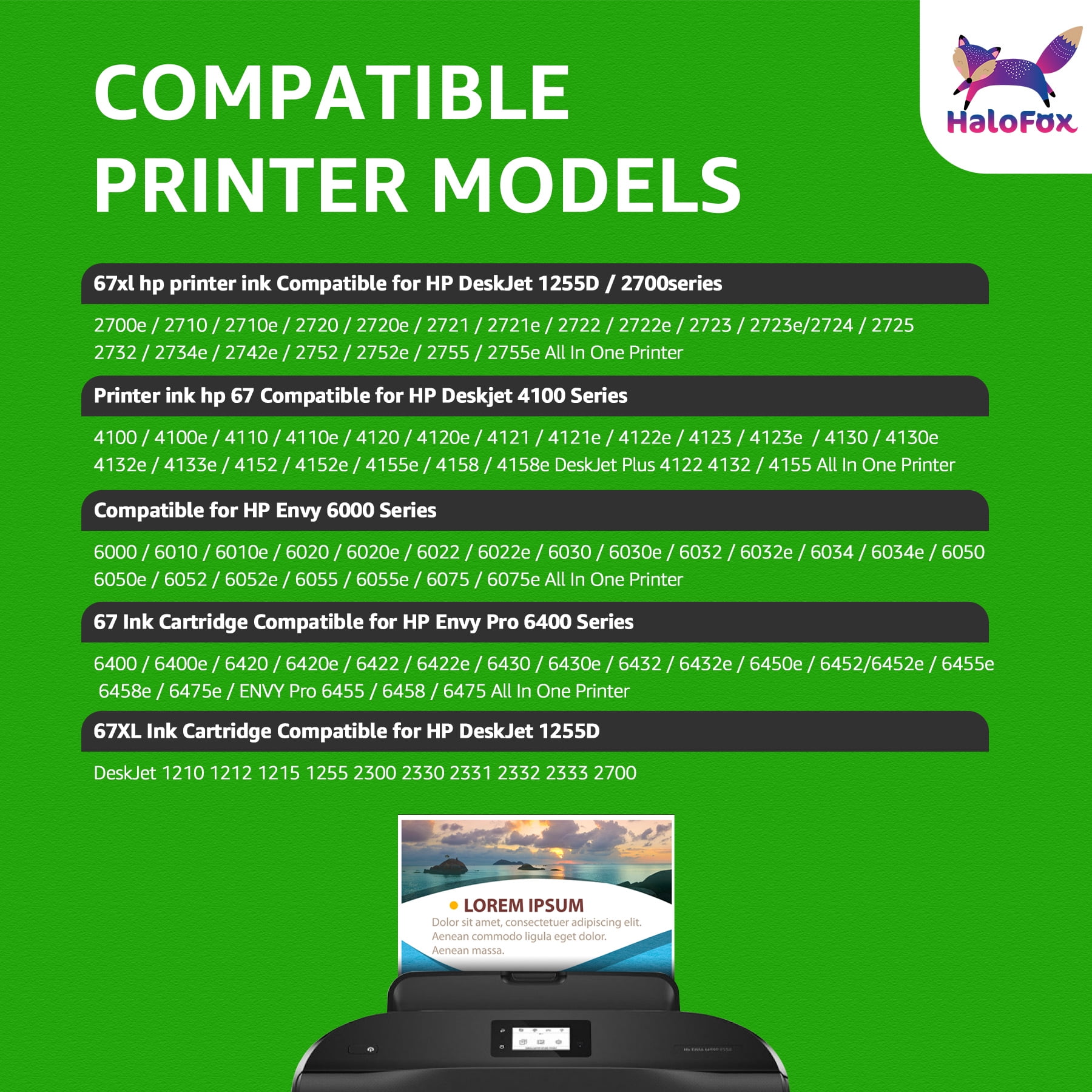 $144.48🦊𝑯𝒂𝒍𝒐𝒇𝒐𝒙 𝒉𝒊𝒈𝒉 𝒚𝒊𝒆𝒍𝒅 67𝒙𝒍 𝒊𝒏𝒌 𝒄𝒐𝒎𝒑𝒂𝒕𝒊𝒃𝒍𝒆 𝒇𝒐𝒓 𝒉𝒑 67 𝒊𝒏𝒌 𝒄𝒂𝒓𝒕𝒓𝒊𝒅𝒈𝒆𝒔, 𝒃𝒓𝒊𝒏𝒈𝒔 𝒉𝒊𝒈𝒉𝒆𝒓 𝒊𝒏𝒌 𝒄𝒂𝒑𝒂𝒄𝒊𝒕𝒚 𝒂𝒏𝒅 𝒎𝒐𝒓𝒆 𝒑𝒓𝒊𝒏𝒕 𝒑𝒂𝒈𝒆𝒔. 📦𝑷𝒂𝒄𝒌𝒂𝒈𝒆 𝑰𝒏𝒄𝒍𝒖𝒅𝒆: 1 x 67 xl black ink cartridge, 🗐𝑨𝒗𝒂𝒊𝒍𝒂𝒃𝒍𝒆 𝑷𝒂𝒈𝒆 𝒀𝒊𝒆𝒍𝒅: 📃750 pages per 67xl black ink cartridge 🖨𝑪𝒐𝒎𝒑𝒂𝒕𝒊𝒃𝒍𝒆 𝑷𝒓𝒊𝒏𝒕𝒆𝒓𝒔: 🖨️HP DeskJet 1255D / 2700series: 2700e / 2710 / 2710e / 2720 / 2720e / 2721 / 2721e / 2722 / 2722e 2723 / 2723e / 2724 / 2725 / 2732 / 2734e / 2742e / 2752 / 2752e / 2755 / 2755e 🖨️HP Deskjet 4100 Series: 4100 / 4100e / 4110 / 4110e / 4120 / 4120e / 4121 / 4121e / 4122e / 4123 / 4123e / 4130 4130e / 4132e / 4133e / 4152 / 4152e / 4155e / 4158 / 4158e DeskJet Plus 4122 / 4132 / 4155 🖨️HHP Envy 6000 Series: 6000 / 6010 / 6010e / 6020 / 6020e / 6022 / 6022e / 6030 / 6030e / 6032 6032e / 6034 / 6034e / 6050 / 6050e / 6052 / 6052e / 6055 / 6055e / 6075 / 6075e 🖨️HP Envy Pro 6400 Series: 6400 / 6400e / 6420 / 6420e / 6422 / 6422e / 6430 / 6430e / 6432 / 6432e 6450e / 6452 / 6452e / 6455e / 6458e / 6475e / ENVY Pro 6455 / 6458 / 6475 🖨️HP DeskJet 1255D: DeskJet / 1210 / 1212 / 1215 / 1255 / 2300 / 2330 / 2331 / 2332 / 2333 / 2700 💜𝑰𝒏𝒔𝒕𝒂𝒍𝒍𝒂𝒕𝒊𝒐𝒏 𝒊𝒏𝒔𝒕𝒓𝒖𝒄𝒕𝒊𝒐𝒏𝒔: Step 1: Remove plastic protective cap. Step 2: Remove the plastic protective tape. Step 3: Insert cartride into its color-coded slot,making sure it is securely seated. Note: DO NOT Touch and Remove the chip & DO NOT Touch the ink nozzles. 🦊𝑾𝑯𝒀 𝑼𝑺: More and more buyers think HP 67 ink cartridge is too expensive, they need cheaper 67xl ink cartridges with good quality. And We produce high-standard ink 67 through our own factory and sell them directly to customers, bringing high-quality products to customers with the lowest factory sales price.
