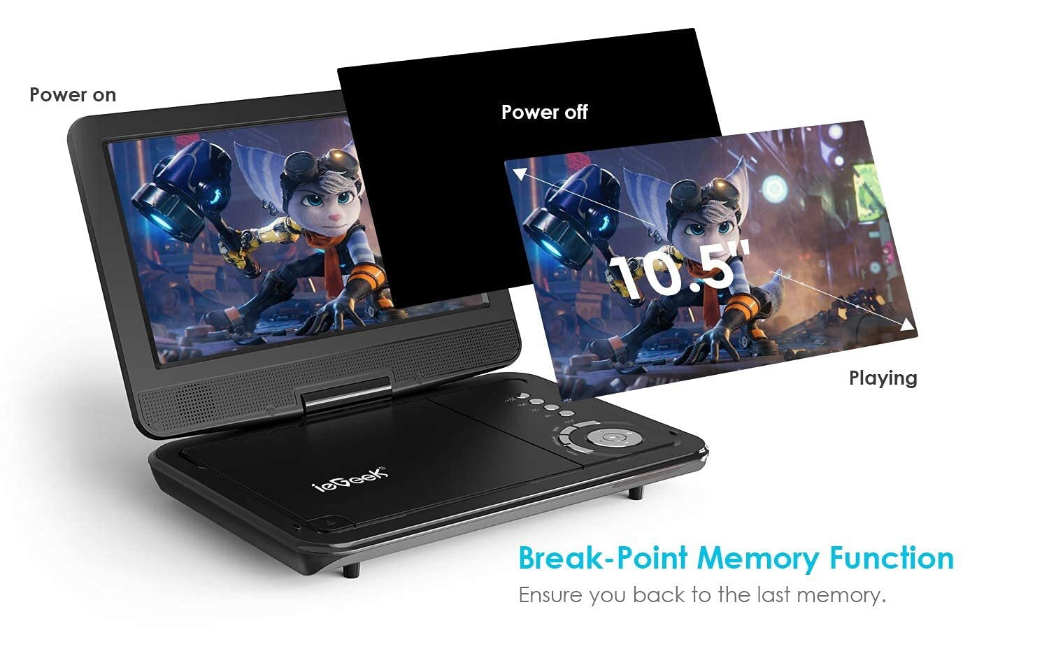 $85.99Original price was: $85.99.$51.59Current price is: $51.59.🖥️【Rotatable HD Screen】 Adopts 12.5 Inch portable DVD player 10.5 Inch 1024*600 LCD screen to present a splendid visual impression. 270° rotation 180° flip features allow you to swivel the screen to your favorite angle or transform it into a tablet shape. Combined with the characteristics of small size, ieGeek portable dvd player can be applied to more scenes like road trips. 🔋【3 power supply modes】 ieGeek portable DVD player for car supports 5 hours of watching. We also come with an extra 1.8m AC power adapter and car charger. Multiple source supply mode free you from worrying about battery dying out when you are on the way. 🔌【Synchronized Playback】 Allows simultaneous TV playback via an AV to RCA cable (included) or dual screen playback via an AV to AV cable (not included). Portable dvd player can be perfectly satisfied with family use scenarios and viewing scenarios with two children. 💫【Humanized Functions】 ieGeek portable DVD player with loop playback and breakpoint memory functions of DVDs. Equipped with a 3.5mm headphone jack and anti-shake reading technology, you can plug in your own headphones and immerse yourself in the highlights without interruption. 💽【Support Multi Formats】 ✔️ Disc Formats: CD, DVD, DVD + R(-R), DVD + RW(-RW), VCD, SVCD-R(RW), CD -R(RW). ✔️ Video File Formats: VOB, AVI, MPEG 1, MPEG 2, XVID. ✔️ Audio File Formats: MP3, WMA. ✔️ Image File Format: JPEG ✔️ Support Max 32GB USB and SD Card ❌ Blu-ray, DTS and Dolby discs
