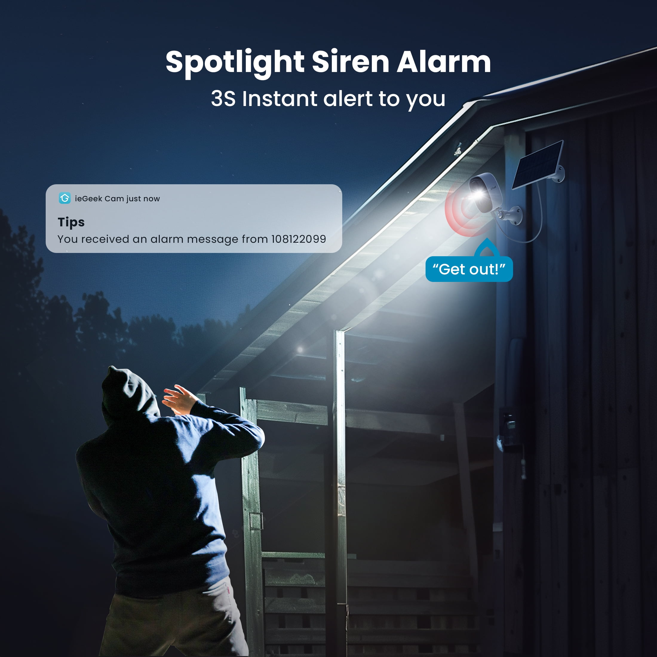 $63.63Original price was: $63.63.$30.10Current price is: $30.10.🔽”I wanna…clearly identify, helpful warning, get reassuring messages, and monitor anytime anywhere.” 💡【2K QHD Color Night Vision & 3 Mode Spotlight Siren Alarm】 Advanced AI Human Recognition achieves that once an intruder enters within 33ft range, outdoor camera’s spotlight will immediately trigger and emit an 80dB sound to warn the intruder, protecting your life and property in time. The latest high-end chips and Sony sensors will send you 2K 3MP QHD color night vision images within 3s through “ieGeek Cam” APP, reminding you to take security actions like turning on two-way talk to scare intruders off. 🖌️【5 Smart Detection Area】 Block out areas like public footpath, swimming pool and neighbor property that you don‘t want to be recorded. Customize monitoring security cameras outdoors, reduce false alarms, and maintain your privacy. 📡【2.4GHz WiFi & Wireless Installation】 Enhanced built-in antennas for use with 2.4GHz WiFi for better penetration and 33ft wider wifi range. Reduce frequent offline worry of solar-powered security camera. Wireless, easy to install within 1 minute on your front porch, driveway, courtyard or garage. 🔽Whether it’s sunny or cloudy, it guards your home security silently. 🌦️【IP65 Waterproof & Solar Powered】 New! Solar outdoor camera has been completely upgraded rubber ring to improve airtightness, waterproof effectively increased by 50%, works properly under −20 °C to 50 °C conditions. Adjust the position of solar panel with 360° mounting bracket and 3m cable to ensure maximum sunlight exposure. Solar panel for security camera keeps eternal power for your home security. 📁【Encrypted Cloud/SD Card Storage】 All clips recorded by security outdoor camera can be saved on SD card. (max in 128G, not included) Encrypted and protected contents prevent to be read and used by outside resources. Back up to cloud service is a double insurance choice. Free perk of 7-day cloud subscription storage services.