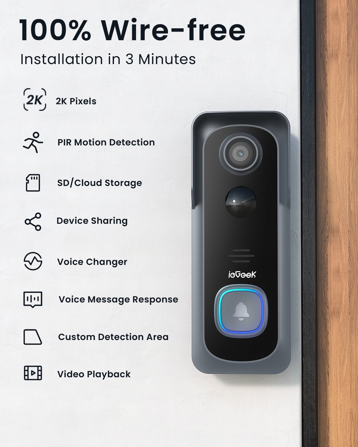 ieGeek 2K Wireless Doorbell Camera, Video Doorbell with Chime Ringer, Smart AI Motion Detection, Voice Changer, 2 Way Audio, Works with Alexa, WiFi, Door Cameras for Home Security