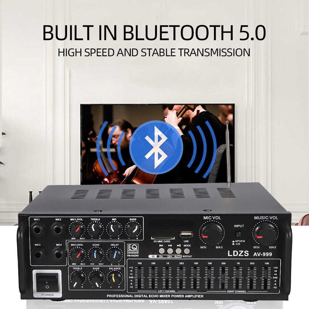 $102.21Original price was: $102.21.$47.29Current price is: $47.29.Wireless Bluetooth Stereo Power Amplifier 5000W Dual Channel Sound Audio Stereo Features: The two-channel Bluetooth stereo amplifier receiver is small but powerful, perfect for your karaoke, home theater, acoustic sound system and monitor headphones, allowing you to enjoy high quality audio. Overall atmosphere, thick and feel very good. Supports 4 microphone inputs and Bluetooth connectivitySound amplifier mixer device comes with Bluetooth wireless music streaming. Suitable for today’s latest devices, for home or car. This compact, integrated room AV receiver has a built-in digital LED display that shows input mode, track and folder name. Also included in the package is an FM antenna and remote control for audio adjustment from a distance. The speaker amplification unit features clear audio source and select buttons, rotary knobs for equalization and master volume adjustment. It also features blue LED illuminated buttons and knobs for high visibility, 2 big headphone outputs with EQ control, reverb, trim, balance, SD, USB interface and more. Specification: Name: 326BT/999BT 5000W Car and Home Power Amplifier Color: Black Audio Output: Stereo L/R RCA Audio Input: USB/SD Voltage: 110V 50/60Hz Rated power (RMS): 2500W+2500W Maximum power: 2000W+2000W Standard Impedance: 4 to 16 ohms Frequency Response: 20KH – 20KHz (+ 3dB) Signal-to-noise ratio: ≥90dB Distortion: ≤0.5 Signal input sensitivity: 200mV (+30mV) Microphone input sensitivity: 9MV (+2mV) Recording output level: 1V Auxiliary output level: 1V Power amplifier type: AV power amplifier Sound Channels: 2 channels Support: USB flash drive / maximum 64GB SD card (not included) Size: 29*24*10cm/11.4*9.5*3.9in Supported modes: FM, Bluetooth Product Includes: 1x Power Amplifier 1x Remote Control 1x User’s Manual Notes: 1, The package does not include U disk/Max 64GB SD card. 2, Please press the mode button to select the mode before use. AUX/Line: Press until “AUX/Line” is displayed on the screen. FM: Press until “FM” is shown on the screen. Bluetooth: Press until “BLUE” is displayed on the screen. 3.The transparent insulating gel under the remote control needs to be taken out before use.