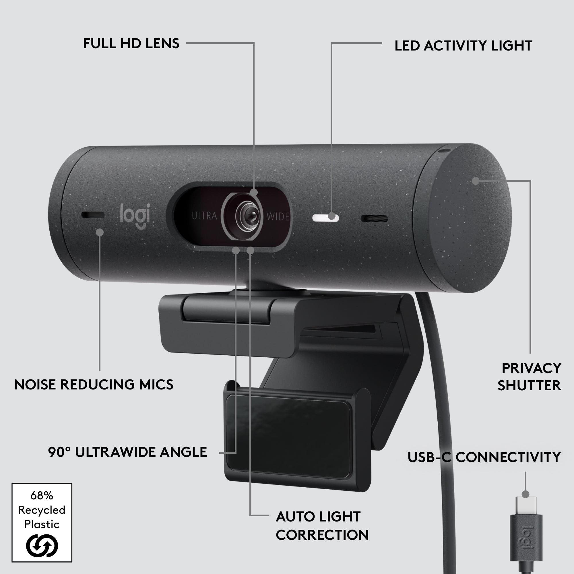Logitech Brio 500 Full HD Webcam with Auto Light Correction, Noise Reduction, Privacy Cover, Graphite