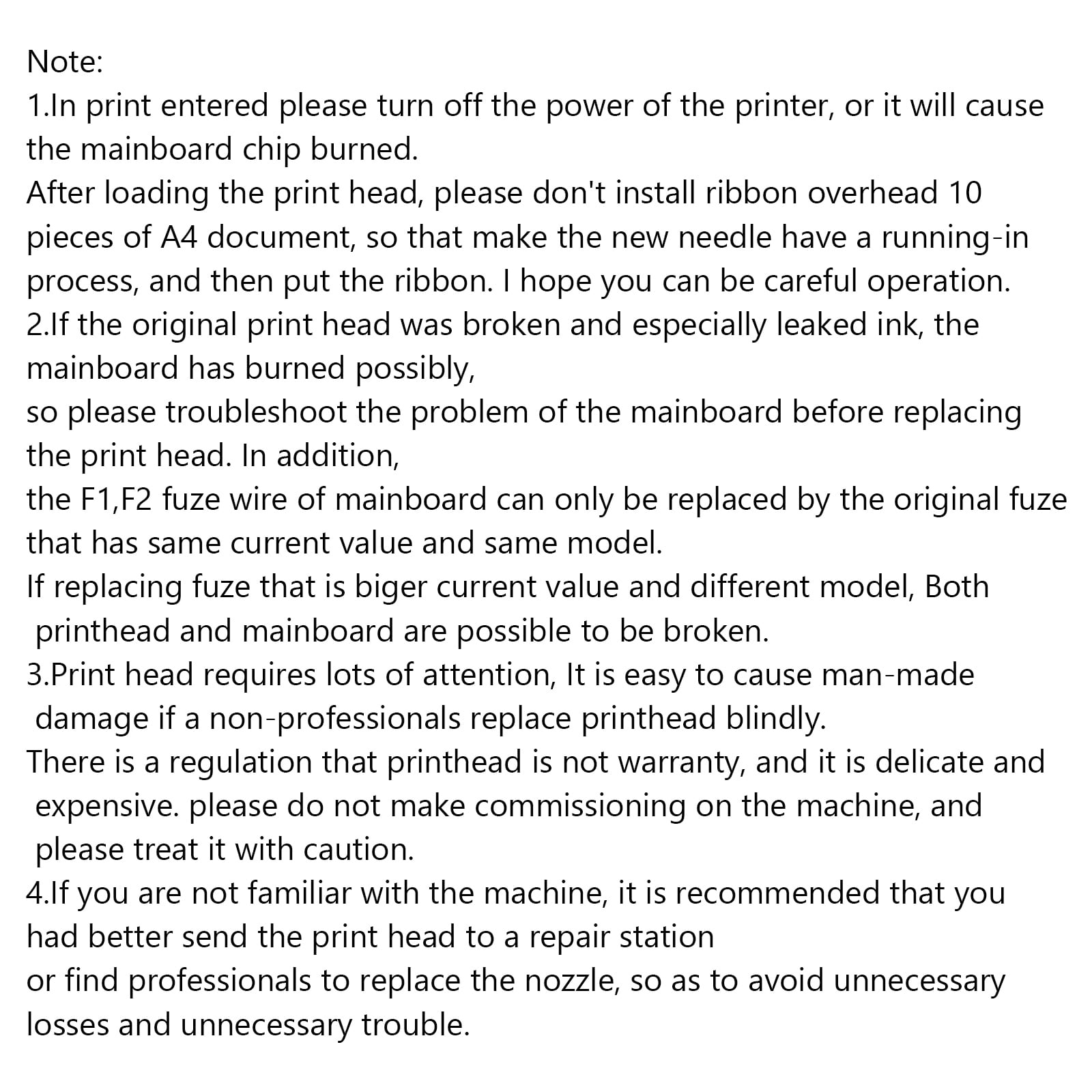 $122.11Reufrbished F173050 Printhead for 1390/1400/1410/1430 Feature: Excellent performance and high quality. Made of high-quality material, durable, firm and stable for us to use. This is a cleaned, thoroughly tested and sealed Printhead. Good stability, long lifespan. Full color function. Product Condition : Original Refurbished Printhead ,95% New. Warranty : One Year Free Warranty , Life-long Service. Size:80x50mm OEM code: F173030/F173050/F173060/F173070 Compatible Models: for epson Stylus Photo 1390/1400/1410/1430/L1800/1500W for epson Stylus Photo R260/R265/R270/R330/R360/R380/R390 for epson Stylus Photo RX560/RX580/RX585/RX590 for epson Stylus Photo D870/G850/G4500/A820/A920 Packing includes: 1 x print head Note: 1.In print entered please turn off the power of the printer, or it will cause the mainboard chip burned. After loading the print head, please don’t install ribbon overhead 10 pieces of A4 document, so that make the new needle have a running-in process, and then put the ribbon. I hope you can be careful operation. 2.If the original print head was broken and especially leaked ink, the mainboard has burned possibly, so please troubleshoot the problem of the mainboard before replacing the print head. In addition, the F1,F2 fuze wire of mainboard can only be replaced by the original fuze that has same current value and same model. If replacing fuze that is biger current value and different model, Both printhead and mainboard are possible to be broken. 3.Print head requires lots of attention, It is easy to cause man-made damage if a non-professionals replace printhead blindly. There is a regulation that printhead is not warranty, and it is delicate and expensive. please do not make commissioning on the machine, and please treat it with caution. 4.If you are not familiar with the machine, it is recommended that you had better send the print head to a repair station or find professionals to replace the nozzle, so as to avoid unnecessary losses and unnecessary trouble.