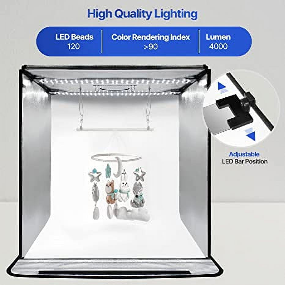$62.25Package Include [1x] 24″ x 24″ Light Box [2x] 120 LED Bar [2x] Elastic Length Adjustable String Clip [1x] Poly Sticky Clay Sheet [1x] White/Black/Sky Blue/Light Orange PVC Background [1x] White Diffuser Cover [10x] Adhesive Velcro Strip [1x] AC110-220V Power Adapter [1x] Product Instruction 【Ceiling String】 Designed for hanging your item easily with elastic length adjustable string. Use a spring clip to hold your object without any hassle. 【Prop-up with Sticky Clay】 Easily set up round objects or irregular shapes with reusable poly sticky clay. Place objects in many different ways. On the floor, on the wall, or stacking on top of other objects. 【Light Level Control / 4000 Lumen】 Position adjustable LED strip. 120 LED Light, 4000LM, 10-level brightness, 3-color mode (White: 7000K Warm: 3000K Daylight: 5000K) 【White Diffuser Cover】 For reflective subjects, install the diffuser cloth under the LED light to prevent the light spots from being reflected on the subjects. Also can be used with an elastic string hanger clip. 【Multi-Angle Angle Shooting】 Front and top openings give you options to take photos with different angles to show the best features and beauty of your object.