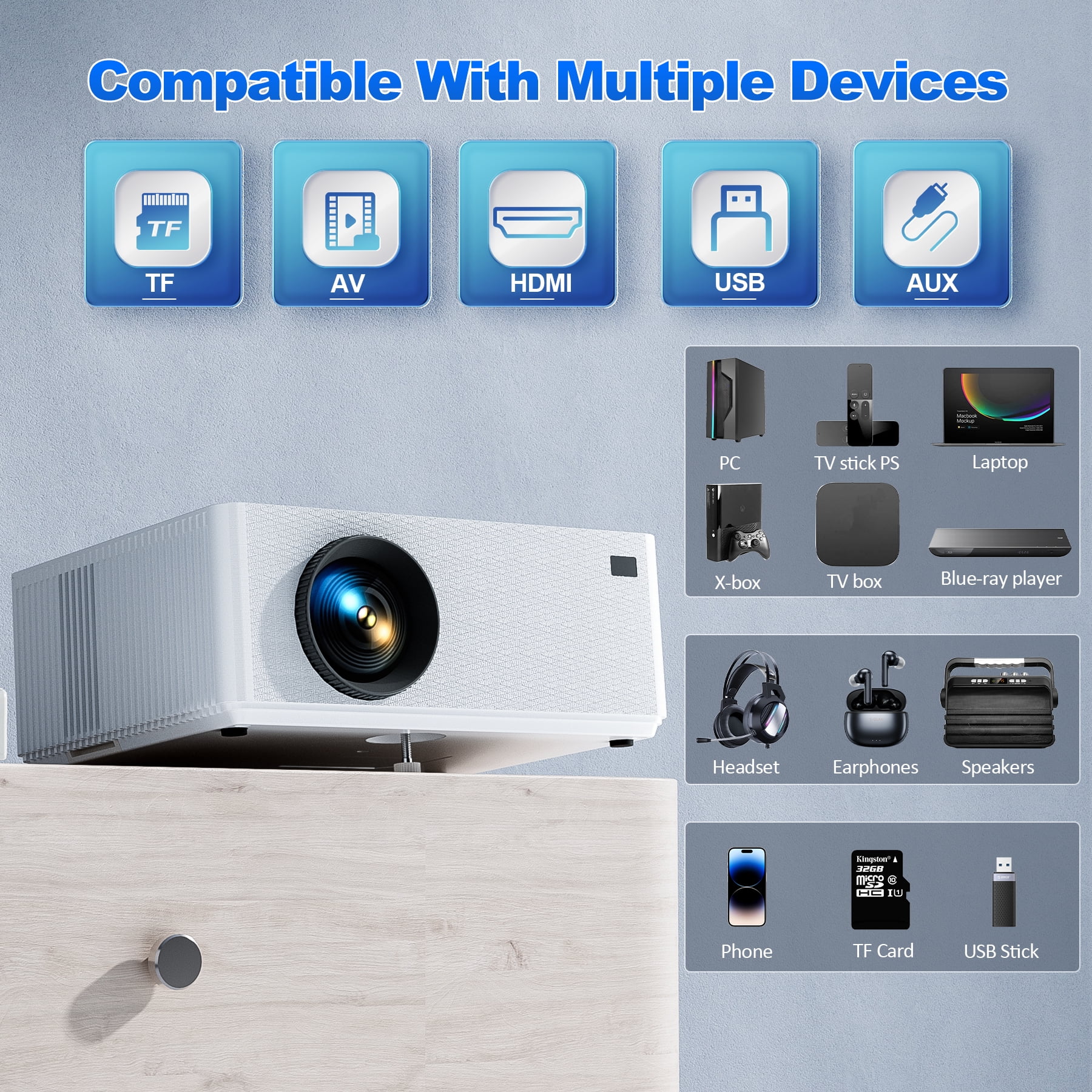 $49.82Projector weight 1.47 lb, small enough to put in your bag or backpack. Versatile and portable, excellent choice for family entertainment and outdoor camping. 10000 lumens brightness, supports 4k@30fps, 1080p@60fps decoding, you can watch videos during the day and outdoors. 6000:1 contrast ratio, providing clear picture and a high-quality color experience. Supporting WiFi 6 (2.4G/5G) and Bluetooth 5.0, equipped with HDMI, USB, 3.5mm earphone ports, easily connected to Android smartphones, tablets, iPhone, iPad, HDMI-enabled devices and speakers. Specifications: Support resolution: 4k, 1920 x 1080p, 1280 x 720p Native resolution: 1280 x 720p Brightness: 10000 lumens Contrast ratio: 6000:1 Projection Size: 40-130 inches Lamp Life: 50,000 hours Connectivity: HDMI, USB Wireless Connectivity: WiFi 6, Bluetooth 5.0 Aspect Ratio: 16:9, 4:3 spacer.gif Package Contents: 1 x Projector 1 x Remote Control 1 x Power Cable 1 x HDMI Cable 1 x User Manual