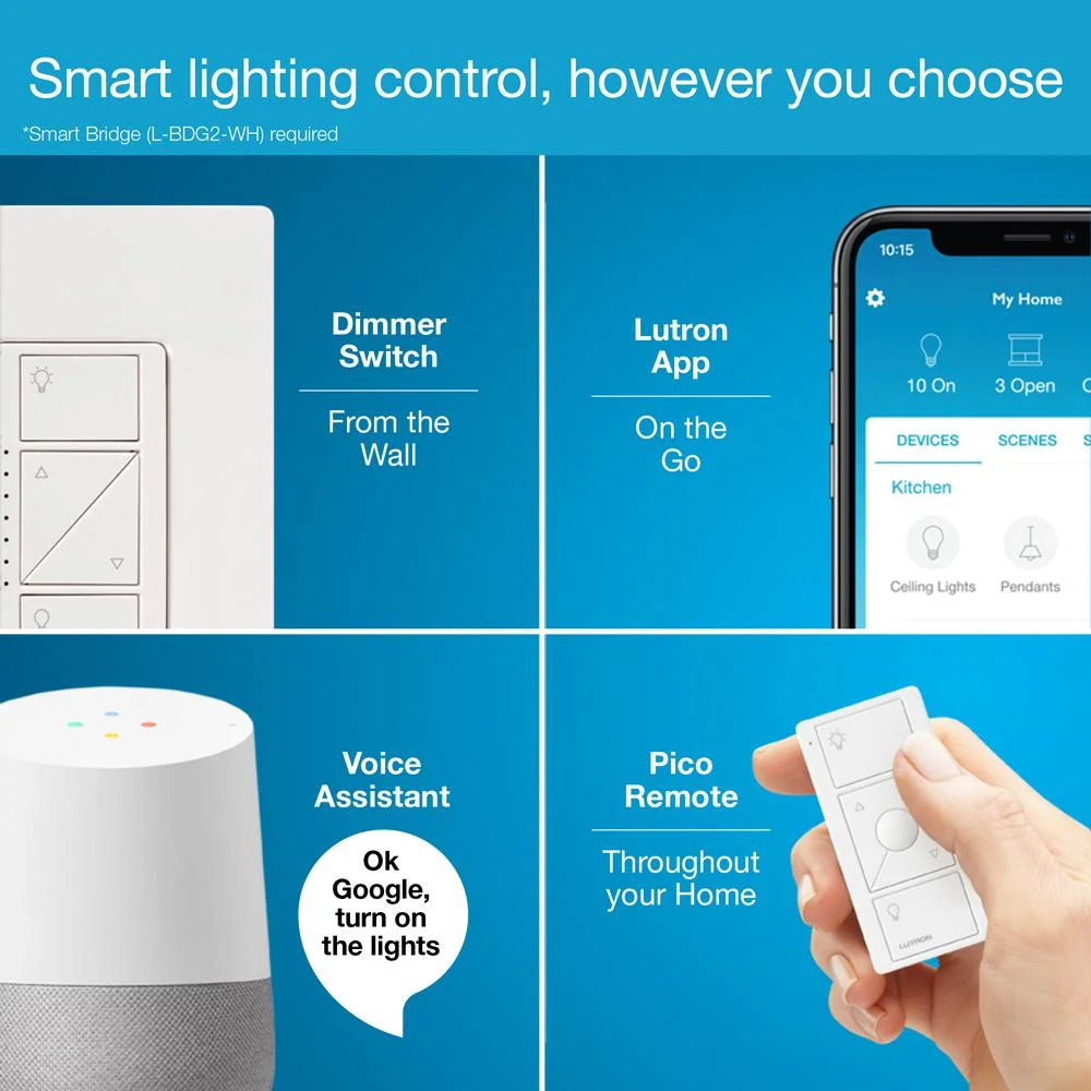 For additional comfort, the Dimmer Switch can be controlled in different ways. The Pico remote can be used for multi-location light controlling from anywhere around your home. The Dimming Switch can also be used with Amazon Alexa, which controls the dimming through voice commands. There is also a free app that can be accessed through a smart phone for easy dimming settings. The Dimming Switch can connect with other smart home brands too. (Smart Bridge is required for all connections, and the Pico remote, Alexa and the Smart Bridge are all sold separately).