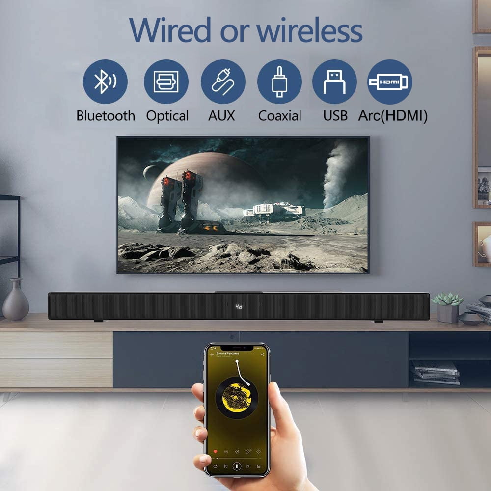 $85.99Original price was: $85.99.$42.99Current price is: $42.99.Sound Bars for TV,Soundbar with Subwoofer, Wired & Wireless Bluetooth 5.0 3D Surround Speakers,Optical/HDMI/AUX/ARC/USB Connection, Wall Mountable 1.【80W Power & 4 Full-range drivers】 This small soundbar is equipped with 80W output power. Paired with your TV, the soundbar creates a louder, more immersive listening experience than through your TV speakers alone. 4 K powerful full-range speakers provide HiFi audio, making comfortable bedrooms and compact spaces full of extensive stereo effects. 2.【Built-in DSP & 3 EQ modes】 Sound bar built-in DSP technology ensured sound output is more stable and accurate. 3 Equalizer modes (Music, Movie, News) to match your favorite voice. Movie Mode: You’ll hear every rip and rumble from your favorite action film, with deeper bass and loud, room-filling sound; Music mode Add clarity and pleasant sound; while it’s News mode pulls out every word and expression from movies or commentary, to ensure that conversations sound crisp and clean. 3.【Wireless Bluetooth 5.0 】 Wireless Bluetooth 5.0 can realize the fast connection between mobile phone and soundbar, efficient and stable transmission, and strong anti-interference. Pair the sound bar to your phone via Bluetooth to soundtrack your next party, or to set the mood for when you want to relax with a good album in rich, audiophile quality. 4.【EASY TO SET UP】 The Soundbar supports Optical/HDMI/AUX/ARC/USB Connection, support for use with mobile phones, tablets, TVs, computers, projectors, set-top boxes, etc. Please read the instructions carefully for use Specifications: Product model: HT 02 Product size:810*98*60mm/31.5*4.8/2.6 inch Bluetooth version:5.0 Speaker:2 inch all frequency speaker/20W*4pcs Product weight: 1.8kg Power supply:DC18V/2A Product list: Soundbar*1 Power adaptor*1 Remote Control*1 User manual*1 HDMl cable*1