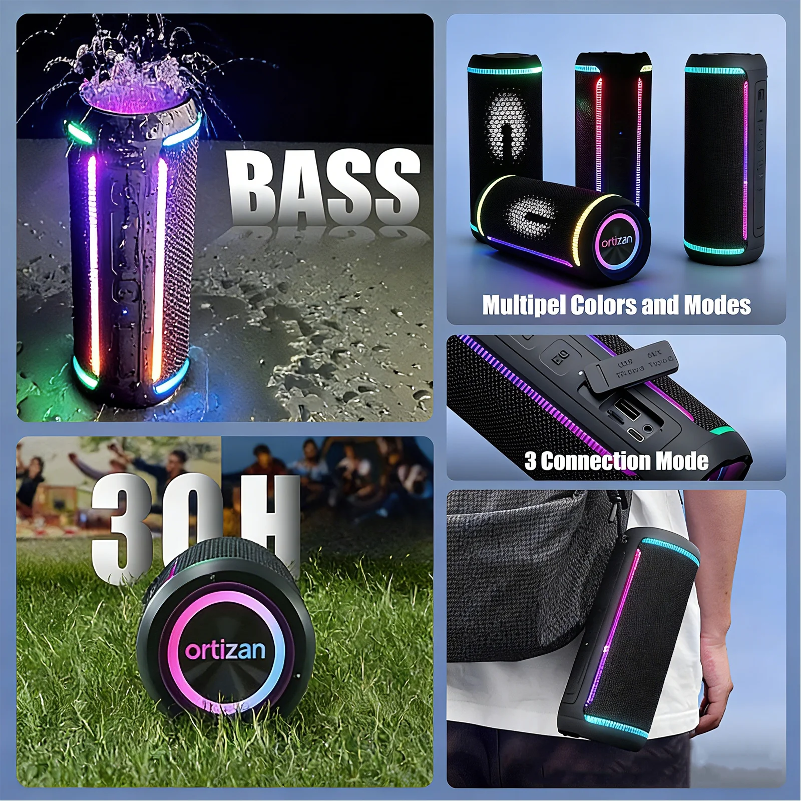Ortizan Portable Bluetooth Speaker, 40W Loud Sound and Deep Bass, IPX7 Waterproof, True Wireless Stereo, Bluetooth 5.3, Colorful Flashing Lights, Preset EQ, USB Play, for Home, Outdoor, Party, Black