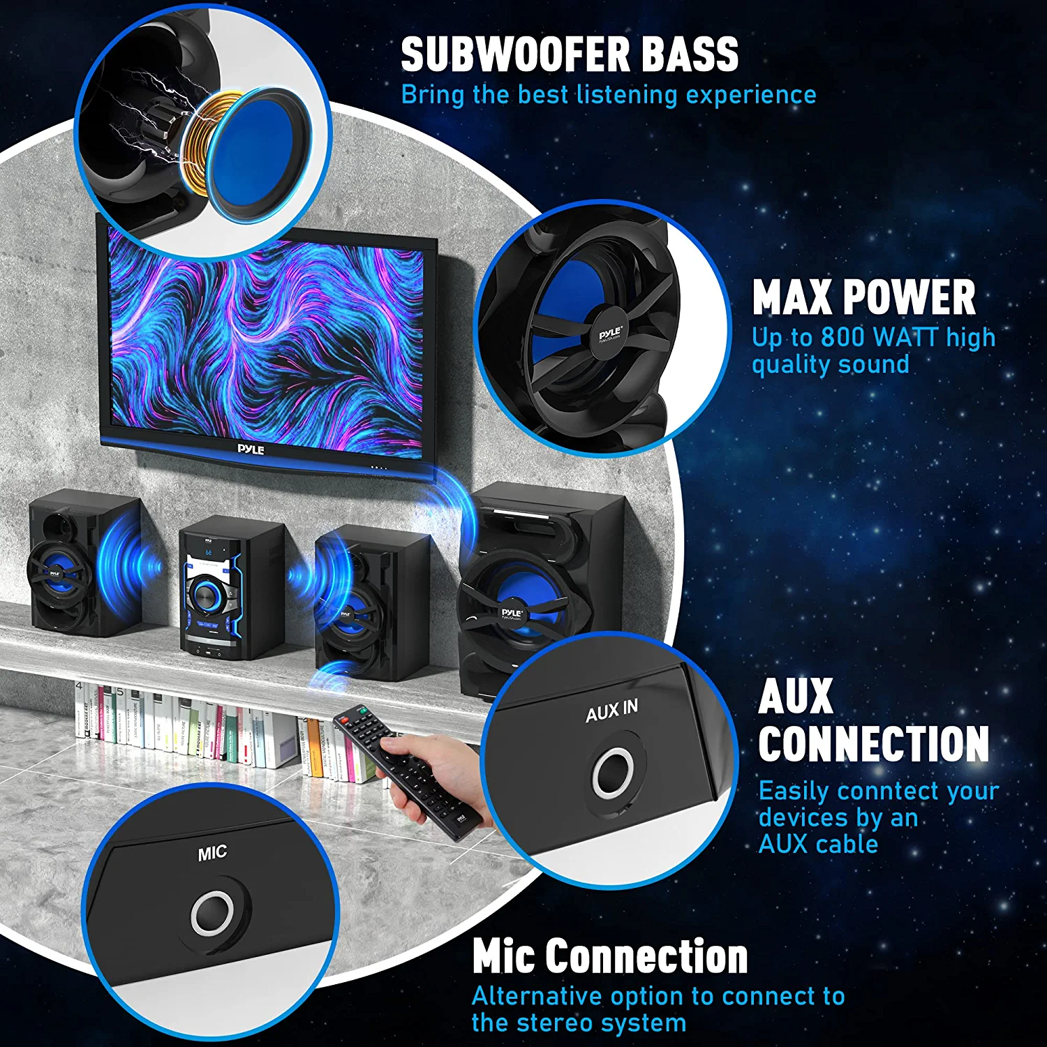 $153.77Original price was: $153.77.$132.43Current price is: $132.43.This Pyle home 300-watt soundbar offers audio streaming capability from -enabled devices 2.0 host & SD™ Card/Multimedia Card for external moving hard drive/flash drive. This high quality, unique soundbars also offers a Plays MP3 & WMA music formats and a Front-panel blue backlight LCD display. The particular product further has an Aux 1, AUX 2 & PC/MP3 audio inputs and a Source selection, play/pause/®/standby/volume onboard control. It also comes with a 5 speakers total: one 5.25″ mid-woofer, two 3″ full range speakers & two 1″ vocal tweeters and a Power output: 300W max/150W RMS – Includes handheld remote, 3.5mm cable & wall power adapter – Piano black finish wooden case – Dim: 4.7″H x 23.8″W x 9.8″D; This Pyle home 300-watt soundbar is a great soundbars, home, theatre, custom, install, home, audio, home, theatre, systems, soundbars. Its dimensions are 26.30 x 13.00 x 7.80 inches, and it weighs 18.69 lbs.
