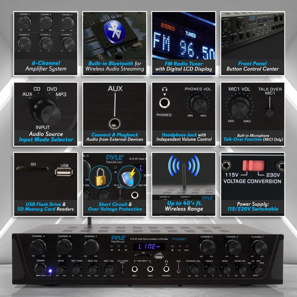 $107.49PYLE PTA66BT – Bluetooth Audio Amplifier, 6-Ch. Audio Source Desktop Stereo Receiver System with FM Radio, MP3/USB/SD/AUX Playback (600 Watt)