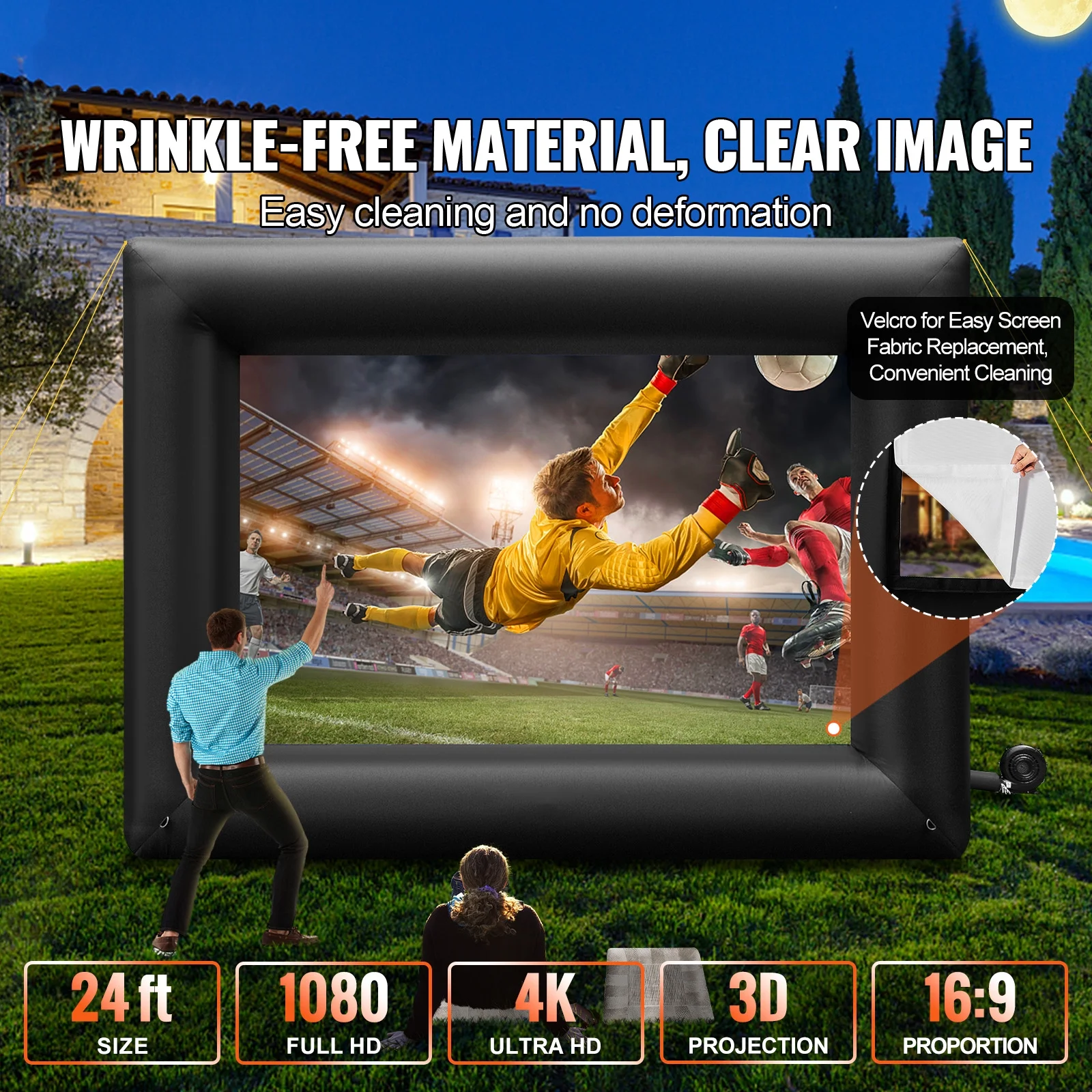 $108.27Brand Introduction VEVORbrand is a leading brand that specializes in equipment and tools. Along with thousands of motivated employees,VEVORbrand is dedicated to providing our customers with tough equipment & tools at incredibly low prices. Today, VEVORbrand has occupied markets of more than 200 countries with 10 million plus global members. Why Choose VEVORbrand? 1.Tough Quality Assurance 2.Incredibly Low Prices 3.Fast & Secure Delivery 4.30-Day Free Returns 5.24/7 Professional Customer Service Product Description 24FT Inflatable Projector Screen Our movie screen is designed to help you get more fun at home parties and outdoor BBQ. Self-blow quickly within 2 minutes when plugged in. It can create a full-size widescreen that displays favorite movies, TV shows, videos, or playing games. A happy atmosphere can be made, while friends, kids, colleagues, or neighbors will have a good time. Note: The blower needs to be turned on and worked continuously when the inflatable movie screen is used. Our white screen is made of 600DD oxford fabric, which is lightweight and easy to clean. Bulky Screen With an aspect ratio of 16:9, the enlarged movie screen allows more people to enjoy the outdoor blockbuster together. Welcome and entertain more guests. Effortless to Set up A powerful air blower, projector screen need 1-2 minutes to be inflated. Self-inflated, no need for extra help, enjoy funny program immediately. 600DD Oxford Fabric Constructed with thick Oxford fabric, it is lightweight, wipe-clean on the surface when dirt, labor-saving. The screen is detachable with magic tape. High Stability & Fix Triangular support design, keep stability on use on windy days. Also, provide ropes, connects those ropes to some fixation devices. Not easy to fall off and enjoy a stable picture. Front & Rear Projection The screen features a function of front and rear projection. You can set up your projector and speakers either at the front or back. Wide Application Movie projector for outdoor use is ideal for pool parties, backyard barbecues, work parties, birthdays, family parties, school parties, giant games, camping, weddings, etc. Specifications Material: 600DD Oxford Fabric Color: Black & White Screen Size (L*W): 16.4 x 9.84 ft/5 x 3 m Overall Size (L*W): 19.69 x 13.12 ft/6 x 4 m Blower Power: 360W Voltage: 110V/60HZ Package Content 1 x Inflatable Movie Screen 1 x Air Blower 1 x Fixation Rope Kit 1 x Bag