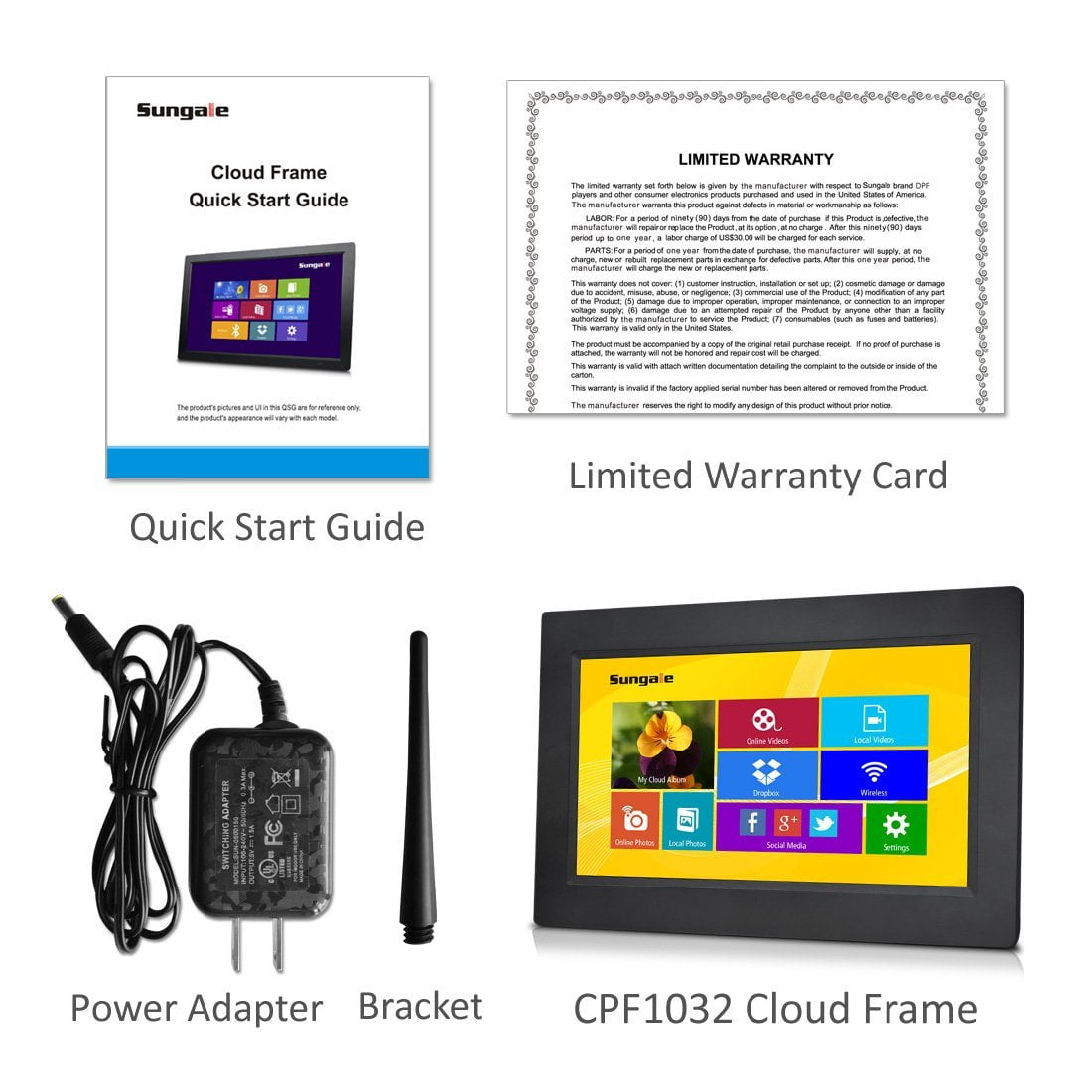 $232.19Share photos from phone to frame in seconds Sungale Cloud Digital Frame is the best way to share your favorite photos with family & friends, especially for parents and grandparents. Using the ‘Sungale Cloud’ free app (available for iOS and Android), or the Sungale Cloud Web Portal, you can easily send photos to your cloud frames anywhere anytime. Invite friends and family to connect to your cloud frame, or connect and send to their cloud frames. Snap a photo on your phone or select some from your computer, select who you want to send them to, it’s that easy to share your best moments with your loved ones. With 16GB on-board memory, and SD/SDHC card slot, plug and play like a traditional digital photo frame is also an option. Choose from smaller size touch screen model, to larger size wall-mountable remote control model, Sungale cloud frame is the best gift idea for your loved ones for any occasion. Easy and Simple Setup Power on your cloud frame by plugging in the power cord, click “Cloud Album” icon, and a user registration message will show up. Use the displayed serial number to register a cloud account, and gain 20GB free cloud storage instantly. The Brand New Sungale Cloud App Search and install the “Sungale Cloud” free app. You can create free cloud account, activate your cloud frame, link to friends and families frame, send photos to cloud frame, manage your cloud frame settings, and manage your account. Energy-Saving – Motion Sensor A smart sensor that wakes the frame when you’re in the room and sleeps when you’re not. Energy-Saving with motion sensor. Invite Family and Friend Send to Your Cloud Frame Your family and friend can register a free cloud account on the Sungale cloud app, link to your cloud frame by providing your serial number and account email, and send their photos directly to your cloud frame. The Sungale Cloud Web Portal Use any web browser to open the Sungale Cloud web portal, you can activate your cloud product, upload and send photos from your PC or Mac to cloud frame, manage your cloud albums, and manage frame settings from anytime anywhere. NOTE: for iMac, please use Google Chrome web browser to open the web portal. Specifications CPU: Quad-core Processor speed: 1.8GHz speed Display size: 19 inch LED Display resolution: 1920×1080 pixels Full HD display Memory: RAM 2GB; Flash 16GB Free Cloud Storage:20GB Built-in Wireless: 802.11b/g/n Multimedia support: Photo / Video / Audio Motion Sensor: Support Earphone: 3.5mm stereo phone jack Speakers: 2 x 3W Memory Card: SD/SDHC (Up to 128GB) USB type : 1x Mini USB OTG; 1x USB host Power Adaptor: Input: 110~240V; Output: 12V 2A