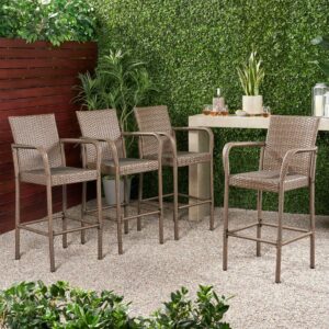 Clevertine Outdoor Wicker Barstool with Iron Frame, Set of 4, Mix Mocha