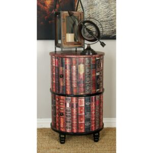 DecMode Red Faux Leather Circular Storage 2 Door Room Cabinet with Stacked Book Design and Scroll Details, 18″ x 18″ x 28″