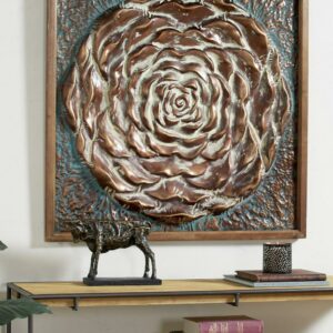Decmode Large Square Aqua & Bronze Metal Rose Wall Decor in Natural Wood Frame, 41.5” x 41.5”