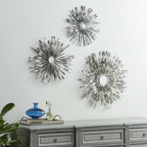 DecMode Silver Metal 3D Looped Sunburst Wall Decor with Mirror Accent (3 Count)