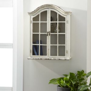 DecMode Vintage White Wood Wall Décor with Glass Doors and Shelving, 22″L x 8″W x 28″H
