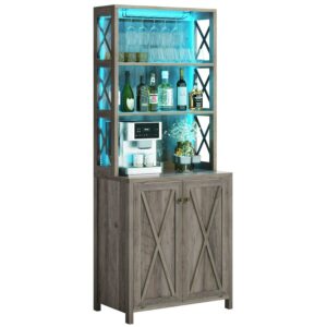 Dextrus Farmhouse Bar Cabinet for Liquor and Glasses, 67″Freestanding Bar Cabinet with Led Light, Washed Gray