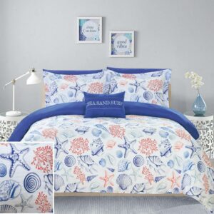 8 or 6 Piece Reversible Comforter Set “Sea, Sand, Surf” Theme Print Design Bed in a Bag
