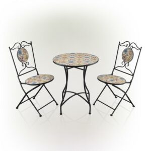 Alpine Corporation Patio Furniture Set with 2 Foldable Chairs and Table, Mediterranean Tile