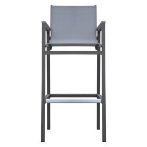 Armen Living Marina Outdoor Patio Barstool in Grey Powder Coated Finish with Grey Sling Textilene and Grey Wood Accent Arms