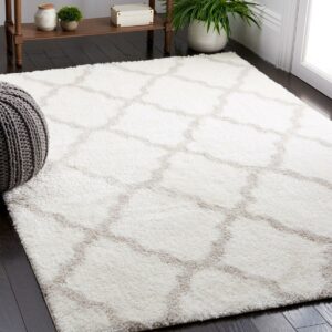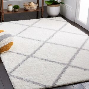 SAFAVIEH Tahoe Gerald Quatrefoil Shag Area Rug, 5′ x 7′, White/Silver