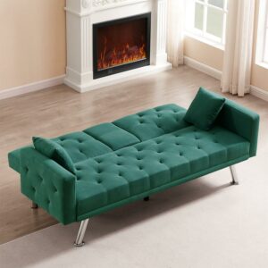 Aukfa 40.5” Wide Velvet Chaise Futon Convertible Sofa Bed, Tufted Back, 2 Pillows, Green