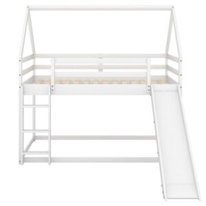 Aukfa Low Bunk Bed, Twin-Over-Twin House Bed Frame for Kids with Slide – White