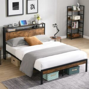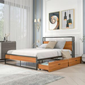Aukfa Metal Queen Size Bed Frame with 2 Storage Drawers, USB Ports, Headboard Shelf, Brown