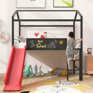Aukfa Metal Twin Loft Bed with Slide and Wooden Blackboard, House Shaped Top, Black&Red