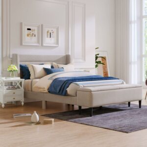 Aukfa Queen Upholstered Bed with Storage Ottoman Bench, Linen Upholstered Platform Bed, Beige