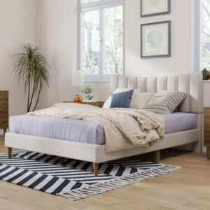 Aukfa Queen Upholstered Bed Frame, Platform Bed with Headboard – Beige