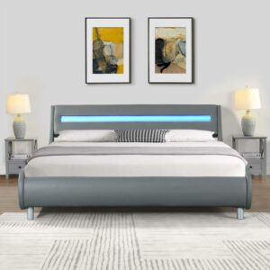 Aukfa Upholstered LED Bed Frame, Faux Leather Queen Platform Bed with 16 LED Light Headboard – Gray