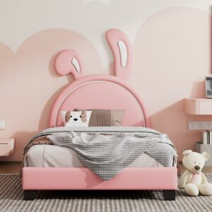 Aukfa Upholstered Platform Bed with Bunny Ears Headboard for Kids, Faux Leather Twin Bed Frame – Pink