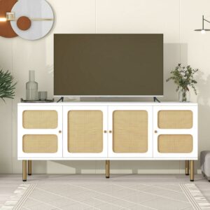 Aukfa Wooden TV Stand for TVs up to 70″ – TV Cabinet with 4 Textured Rattan Doors – White