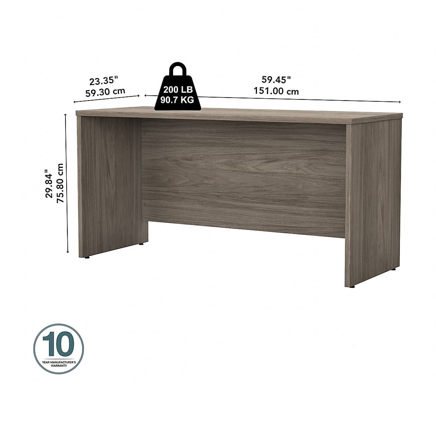 $284.49The Bush Business Furniture Studio C 60W Credenza Desk gives you just the right amount of workspace with a sturdy design and refreshing finish you’ll love. A durable thermally fused laminate construction stands up to your 40-plus hour work week, resisting scratches and stains to look great for years. Clean lines and an extended modesty panel create a classic desk design with several contemporary and traditional finish options to fit any workspace. Spread out on the 60 inch desk surface with your computer, notebook and more for a productive day, or add coordinating items from Studio C to create a larger configuration for all the multitasking space you need. This computer desk is backed by a 10 Year Manufacturer’s Warranty and meets ANSI/BIFMA test standards for safety and performance. See the full collection for coordinating items available. American made with U.S. and imported parts. Materials: Engineered wood and Laminates. Features: Durable thermally fused laminate finish fends off scratches and stains to protect the Credenza Desk 60W x 24D surface offers space to spread out with integrated cable management to conceal computer cords Clean lines and extended modesty panel provide a professional feel Can be used with coordinating Studio C products to form L Shaped and U Shaped Desks Accepts Mobile File Cabinets, Pencil Drawer or Keyboard Tray (all sold separately) to complete your office Computer desk is available in several contemporary and traditional finishes to complement any office Tested to meet ANSI/BIFMA quality standards for safety and performance Backed by the Bush Business Furniture 10 Year Manufacturer’s Warranty Specifications: Product Dimensions: 60W x 24D Desk/Credenza/Return: 59.45″W x 23.35″D x 29.84″H Product Color: Modern Hickory Assembly Required: Yes