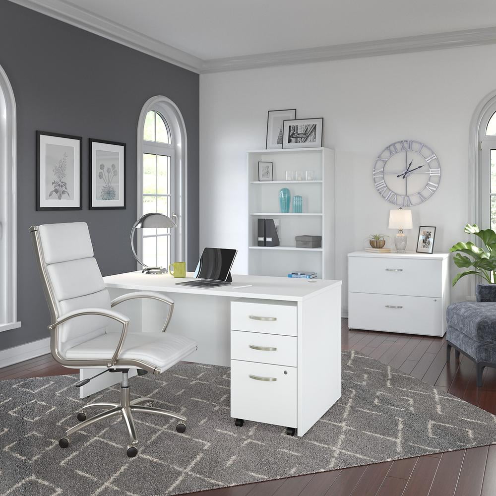 $254.50The Bush Business Furniture Studio C 5 Shelf Bookcase looks great, works hard and adjusts to fit the needs of your office. Designed with 2 fixed and 3 adjustable shelves, the Bookcase holds your books and reference materials with room for your favorite decorative accents. Store a variety of items on the spacious and durable shelves, designed to hold up to 50 lbs each. A thermally fused laminate finish fends off scratches, stains and dents throughout years of everyday use. The 5 Shelf Bookcase features a classic design but comes in a contemporary White or Storm Gray finish to fit perfectly in modern workspaces. Purchase a set of Bookcases to build a complete storage wall that organizes your office and expresses your style. This contemporary 5 Shelf Bookcase comes with a 10 Year Warranty and meets ANSI/BIFMA quality test standards. American made with U.S. and imported parts. Features: Finish: White Durable shelves tested to hold up to 50 lbs. each Material: Laminate Over Engineered Wood, Steel, Metal, Plastic, Thermally Fused Laminate Over Engineered Wood Thermally fused laminate finish fends off scratches and stains to protect the 5 Shelf Bookcase 3 adjustable shelves provide flexibility and 2 fixed shelves add stability 36″ Bookcase provides plenty of storage space for books, knickknacks and more Accepts Bookcase Door Kit (sold separately) to conceal lower shelves Available in contemporary White and Storm Gray finishes to fit any work environment Meets ANSI/BIFMA quality test standards for performance and safety Commercial quality backed by 10 Year Warranty Specifications: Product Dimensions: 72.79″ H x 35.7″ W x 15.35″ D Product Weight: 109 lbs Shelf Dimensions: Adjustable Shelf Depth 13”D; Fixed Shelf Depth 14”D