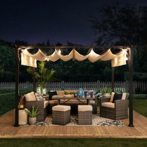 Sunjoy Outdoor Pergola 9 x 12 ft. Patio Black Steel Frame Pergola with Retractable Beige Canopy Shade for Backyard, Garden Activities