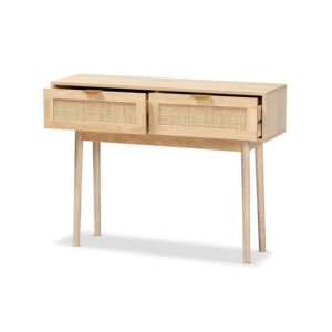 Baird Mid-Century Modern Light Oak Brown Finished Wood and Rattan 2-Drawer Console Table