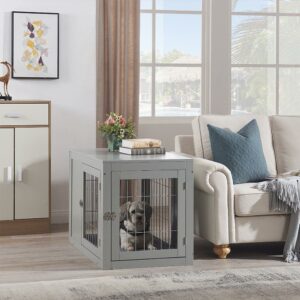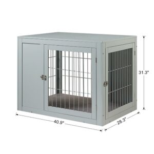 Unipaws Dog Crate End Table with Cushion, Wooden Wire Pet Kennels with Double Doors, Modern Design Dog House, Medium Indoor Use, Gray